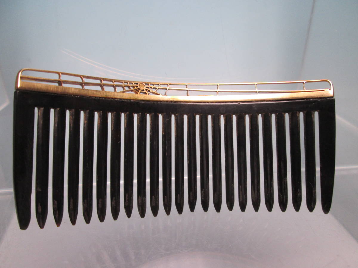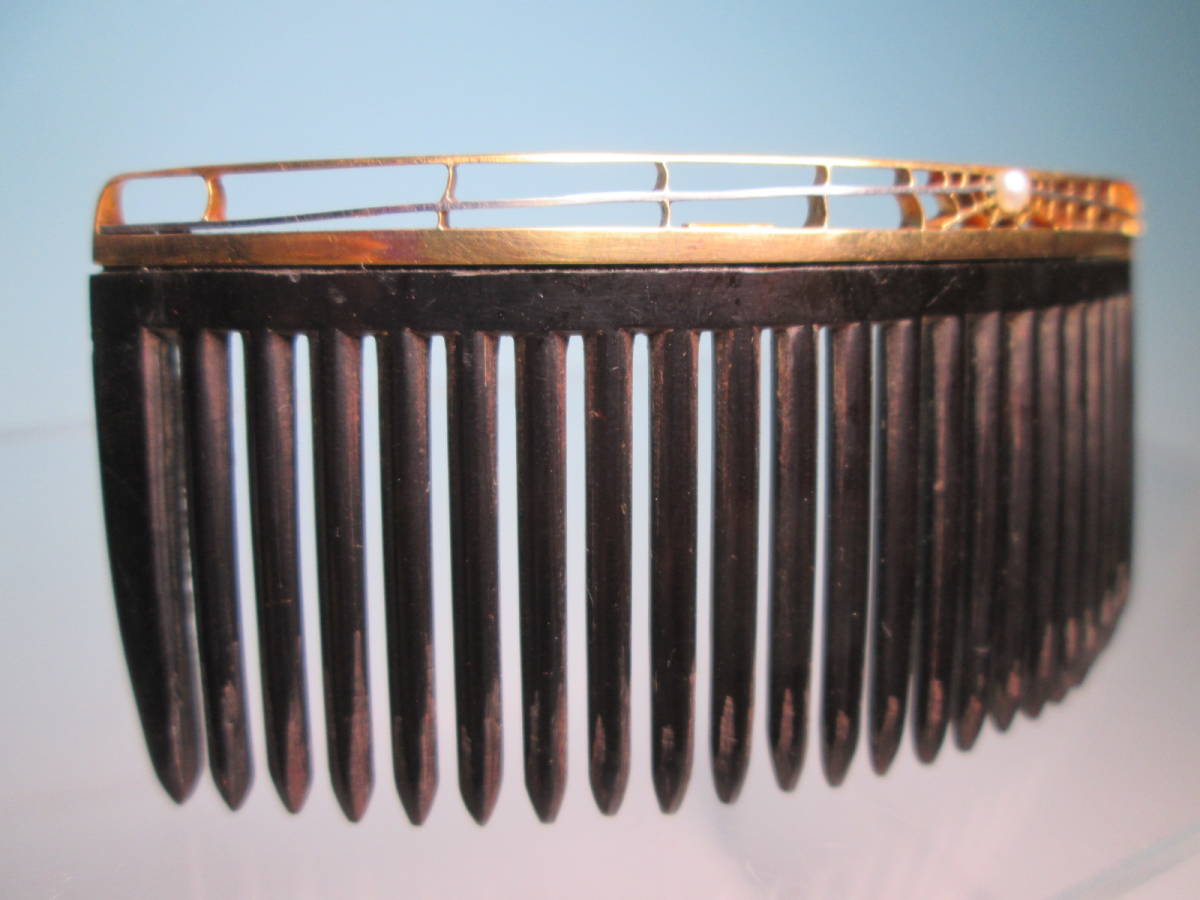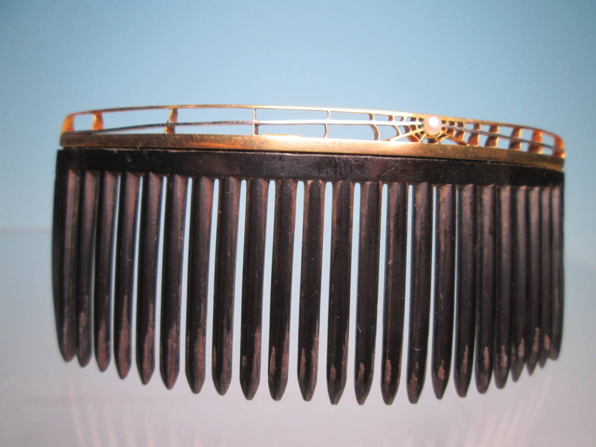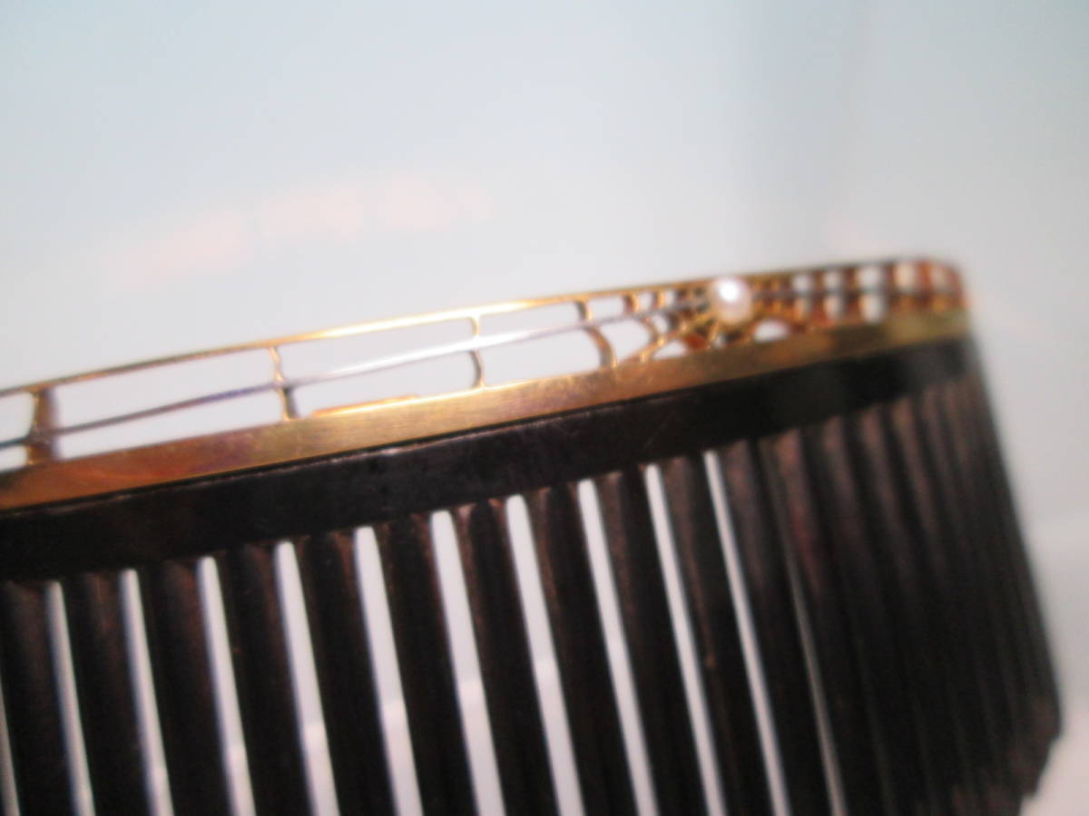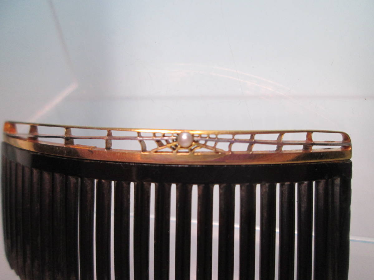 【江月】アンティーク・金彫金細工 蜘蛛の巣透かし文本真珠飾りの櫛 木箱付