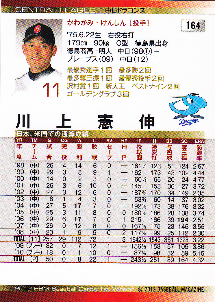 2012BBMベースボールカード1st 164 川上憲伸 中日 徳島県 徳島商業高校 明治大学 ドラフト1位