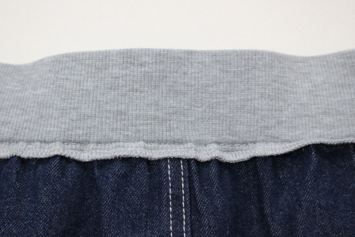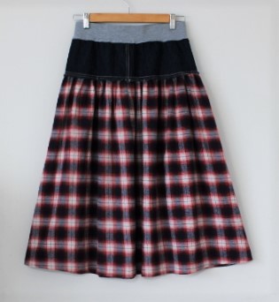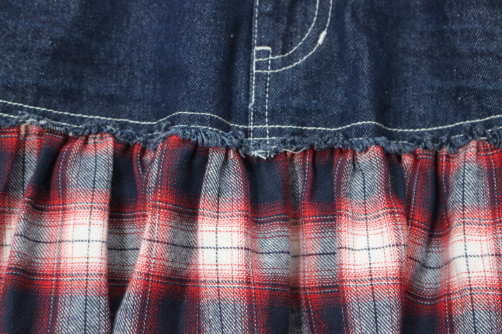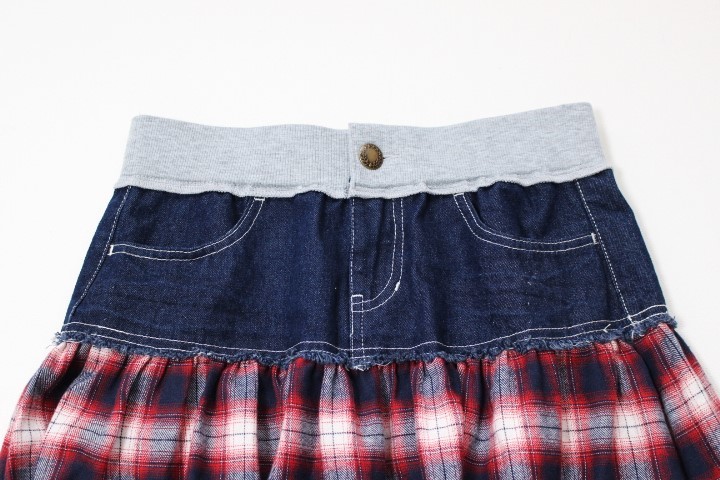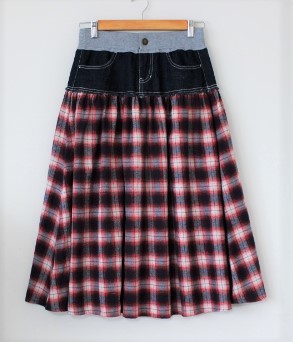 ★ウエストはグレー、上部は紺系のデニム素材、中ほど下はやわらかな素材で赤×紺×白のチェック柄模様です。