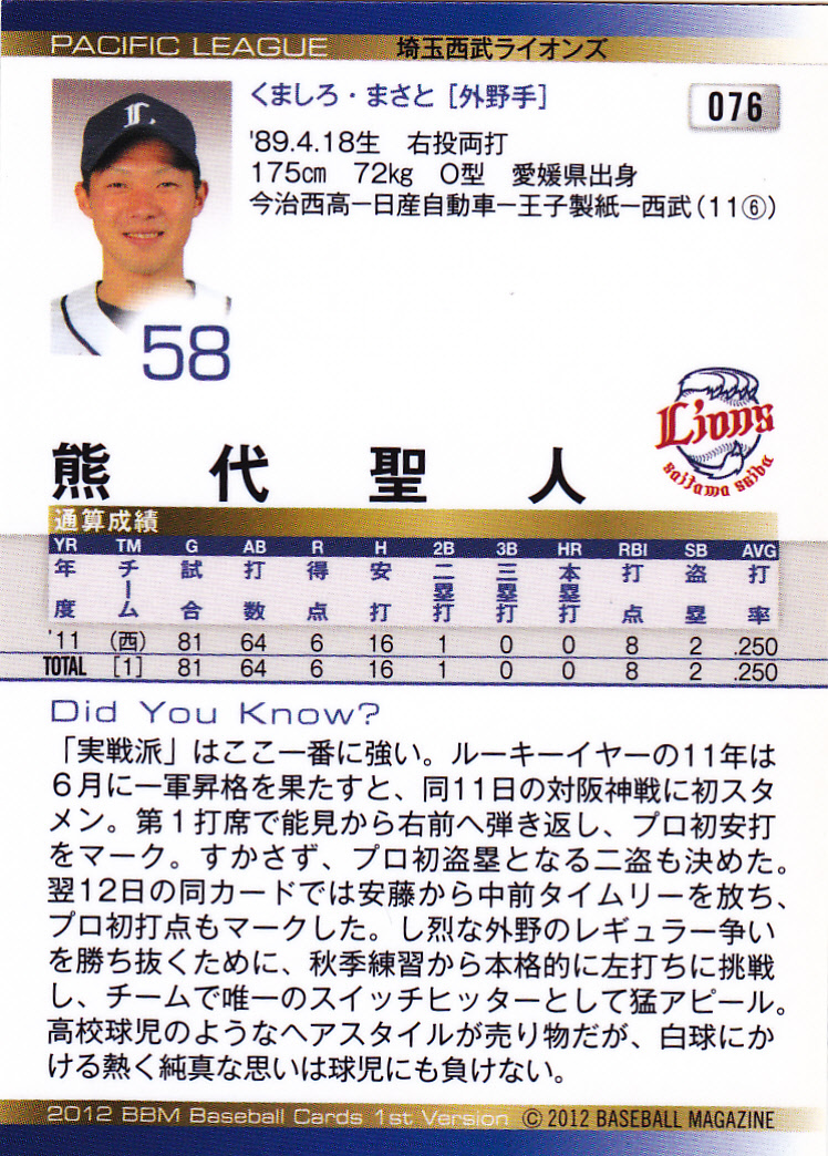 2012BBMベースボールカード1st 076 熊代聖人 西武 愛媛県 今治西高校