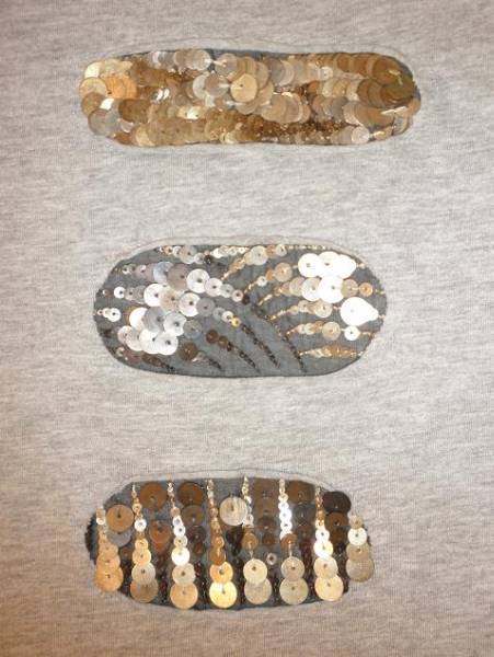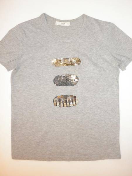 デザイン:半袖のTシャツです。装飾部分はビーズのようなキラキラしたスパンコールではなく、シルバー、ブロンズ、ゴールドのメタルです。