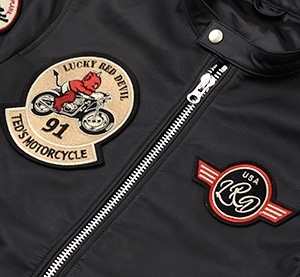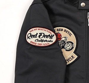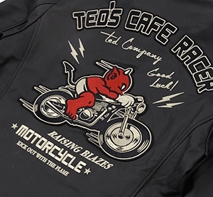 1.1~1.2mmのエンボス加工(表面に凹凸を付ける加工)された牛革を使用、シンプルなシングルフロントスタイルに右袖、フロント両胸には緻密な刺繍のワッペン、バックはワッペンと革に直接の刺繍のコンビネーションが絶妙なバランスで施されTEDMANらしい最高の雰囲気に仕上がっています。