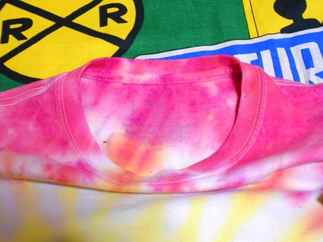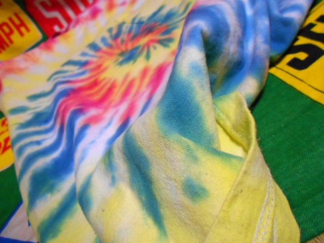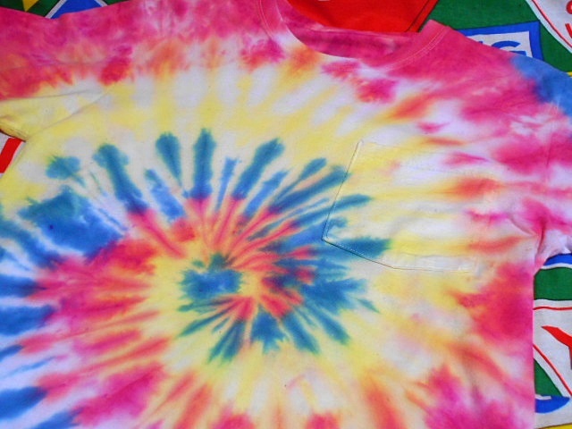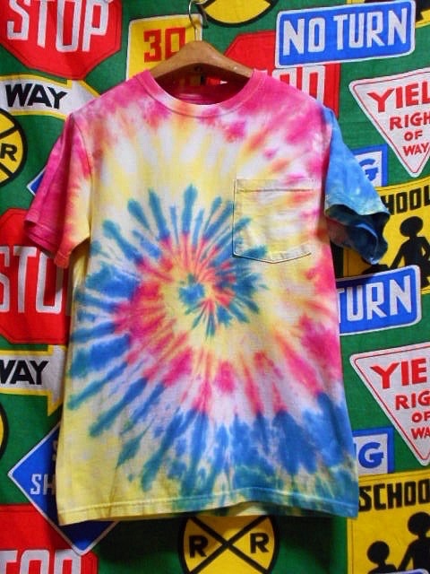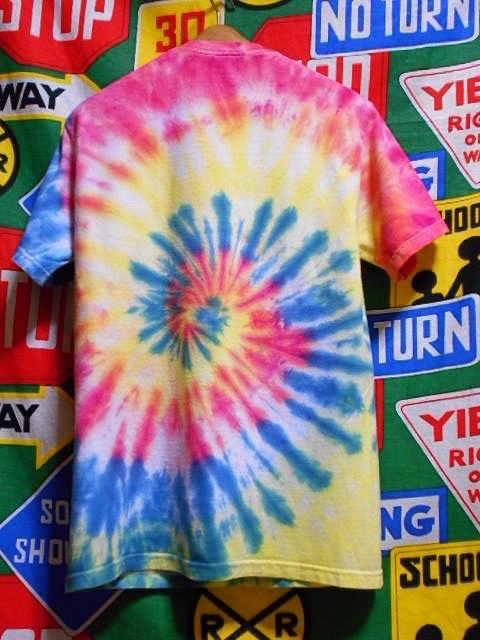元々は無地だったと思われるTシャツをタイ(Tie=縛る)、ダイ(Dye=染める)した物で、1枚1枚染まり具合や色合いが異なるのも面白いTシャツです。