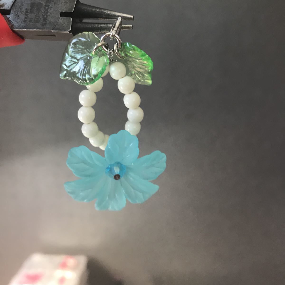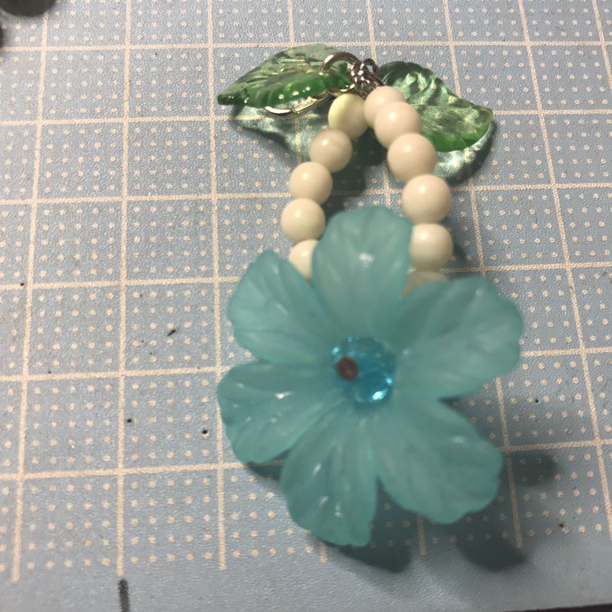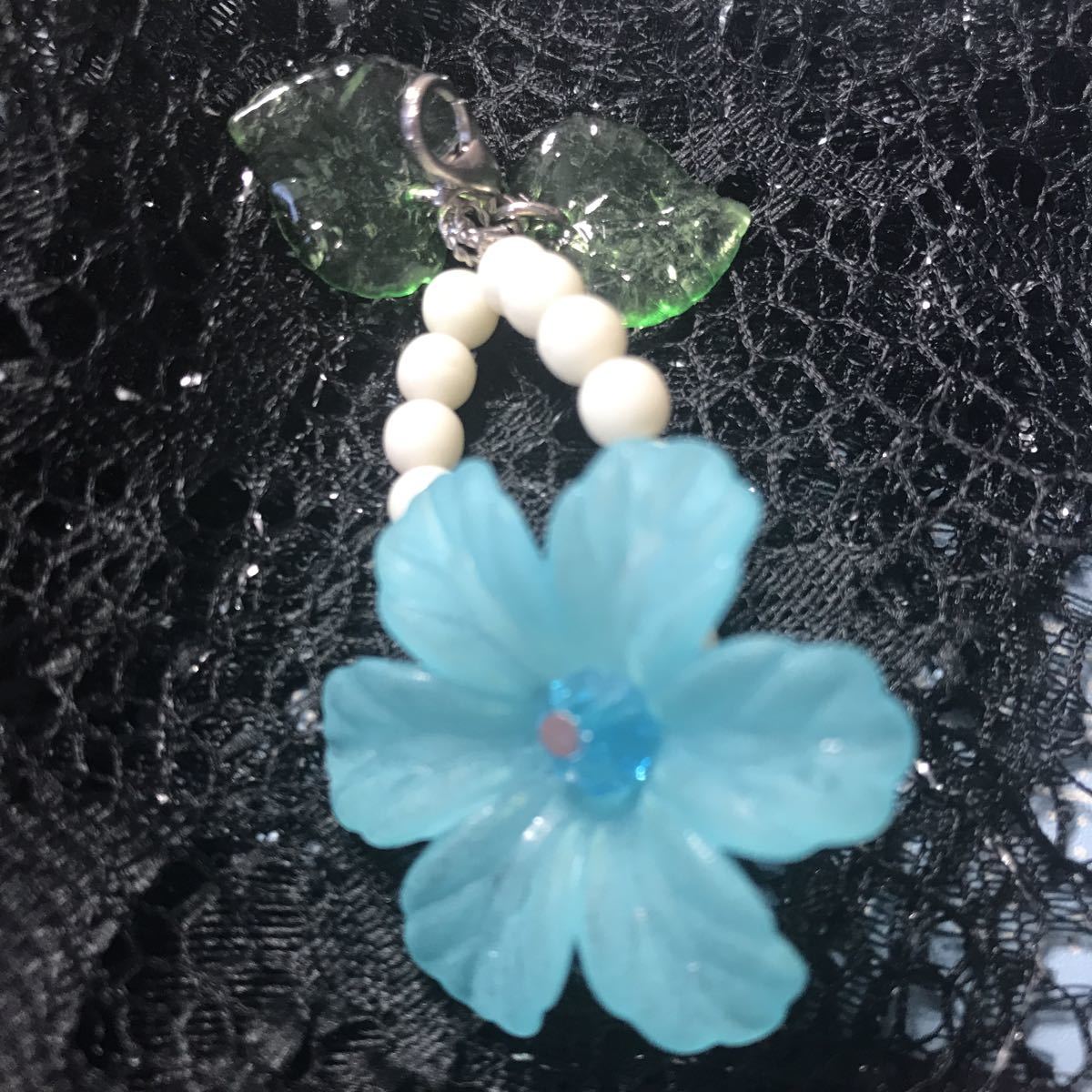 可愛い水色のお花のストラップです、アクリル素材のお花にキラキラガラスビーズをつけました、とても涼しげで可愛いです