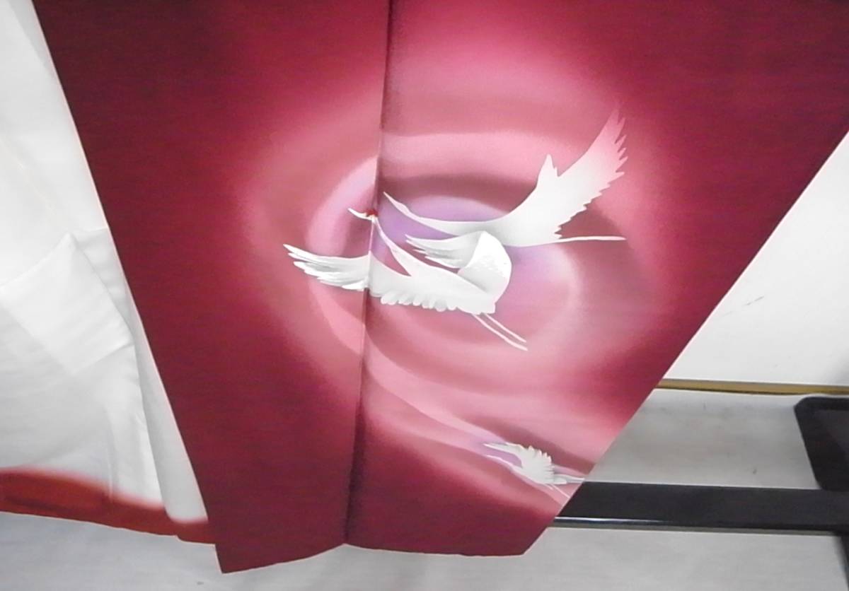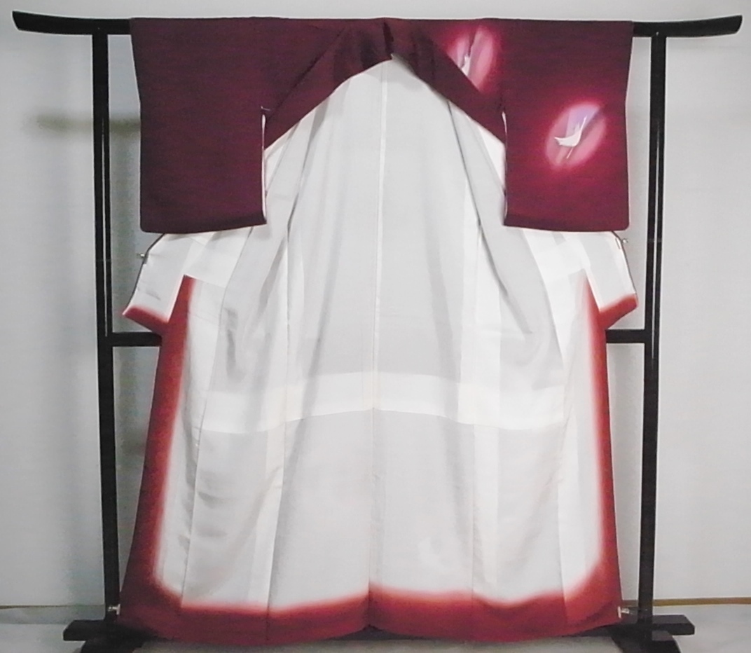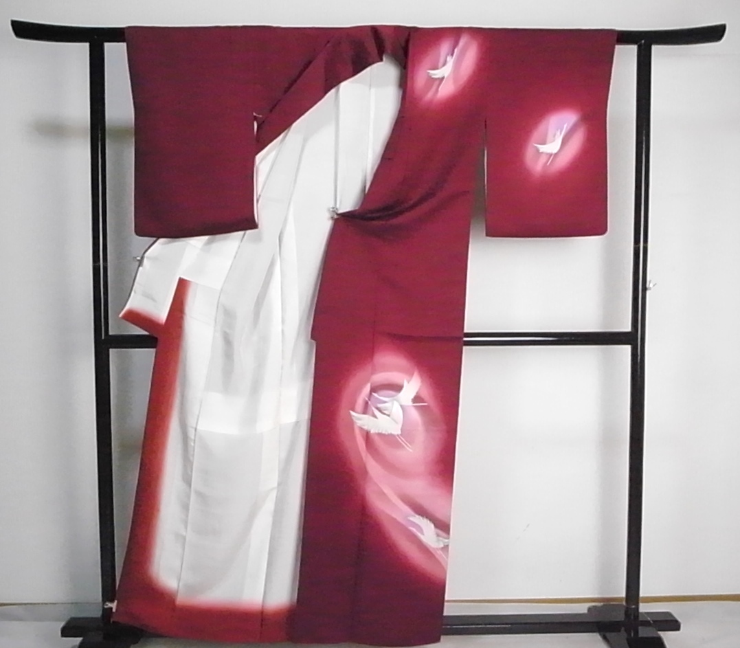 【着物のちさと屋】B868 着物・付下げ 袷 極美品 正絹なし地ちりめん ワイン色・飛翔鶴図柄斜ぼかし模様 刺繍陰紋入
