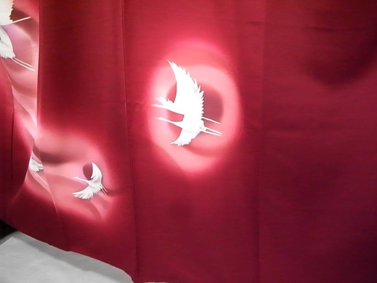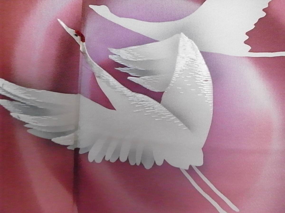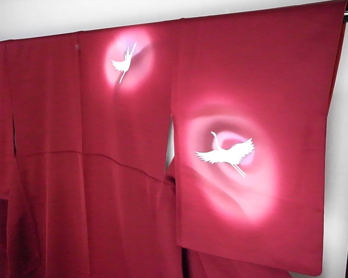 正絹なし地ちりめん ワイン色・飛翔鶴図柄斜ぼかし模様