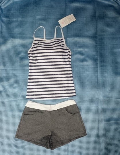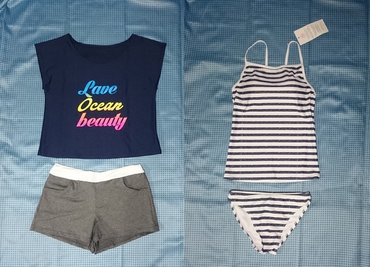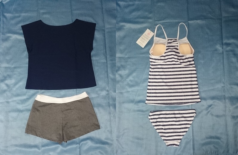 新品のシンプルかわいいカバーアップ水着4点セット商品 \15,000ぐらいのお品です(Tシャツ、ショートパンツ、キャミソール、パンツ)。全て水着の伸縮素材ですので、そのまま水に入ることも出来ます。体形カバーや露出をあまりしたくない人にもおすすめです。Tシャツはネイビー、パンツはグレー、水着上下はネイビーと白のボーダー。色々な組み合わせで楽しむことが出来ます。水着の内側には胸部分にパットが付いています。海やプール、ヨガ、アウトドア等いろいろな場面でお使い頂けると思います。新品ですが自宅保管をご理解の上、気に入られた方いかがですか?