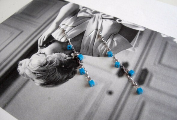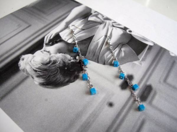 セシル・スタイル・・シリーズです♪フレンチ・ターコイズ・・シックなターコイズのピアスです♪キューブのターコイズに華奢なチェーンを合わせて可憐な表情です♪4ミリ位のキューブカットのターコイズには繊細なチェーンを合わせました♪長さは全長9センチ位です♪イヤリングにも変更出来ます♪お揃いのネックレスやブレスレットも出品しています♪シンプルで飽きのこないいつまでも着けられるデザインを考えて作りました!ハンドメイドをご理解頂いてノークレーム、ノーリターンでお願いします