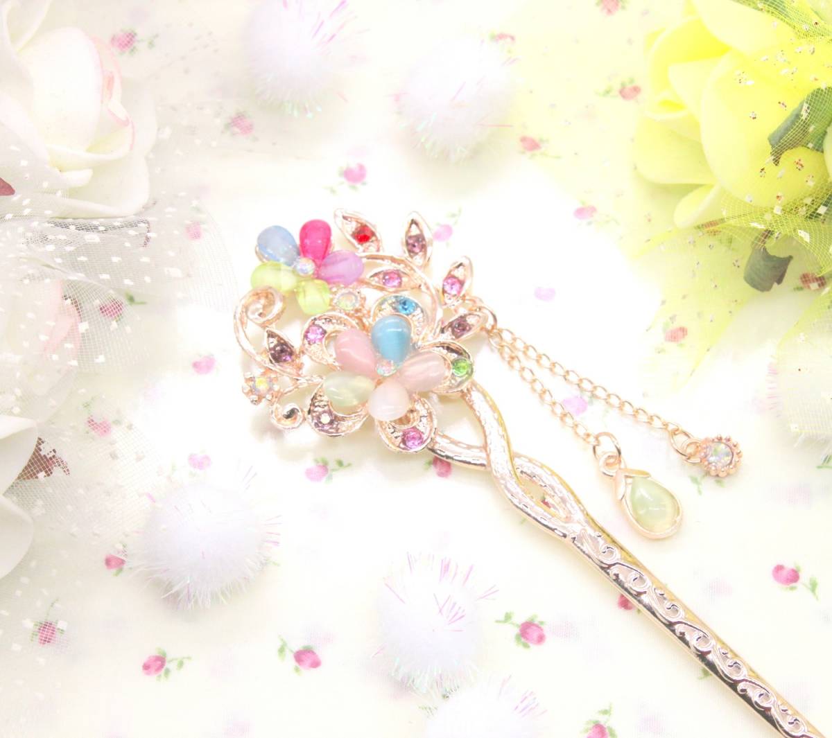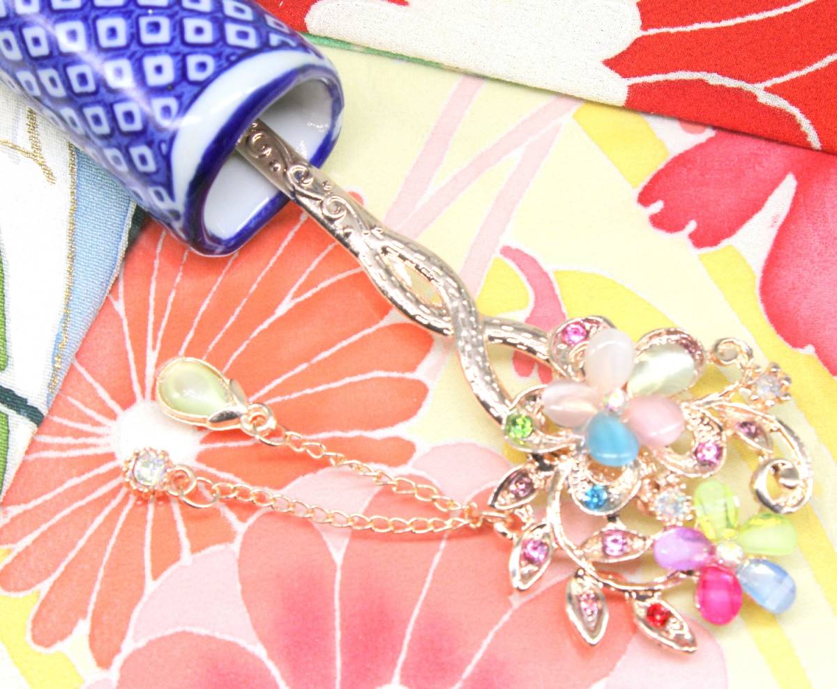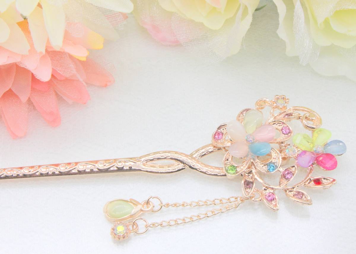 かわいい おしゃれ かんざし 一本 髪飾り ピンクゴールド マルチ カラー カラフル フラワー 桜 花 振袖 留袖 浴衣 ヘアー アクセサリー 新