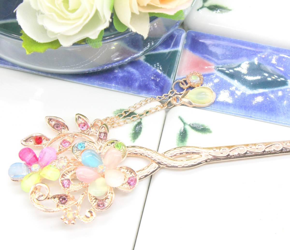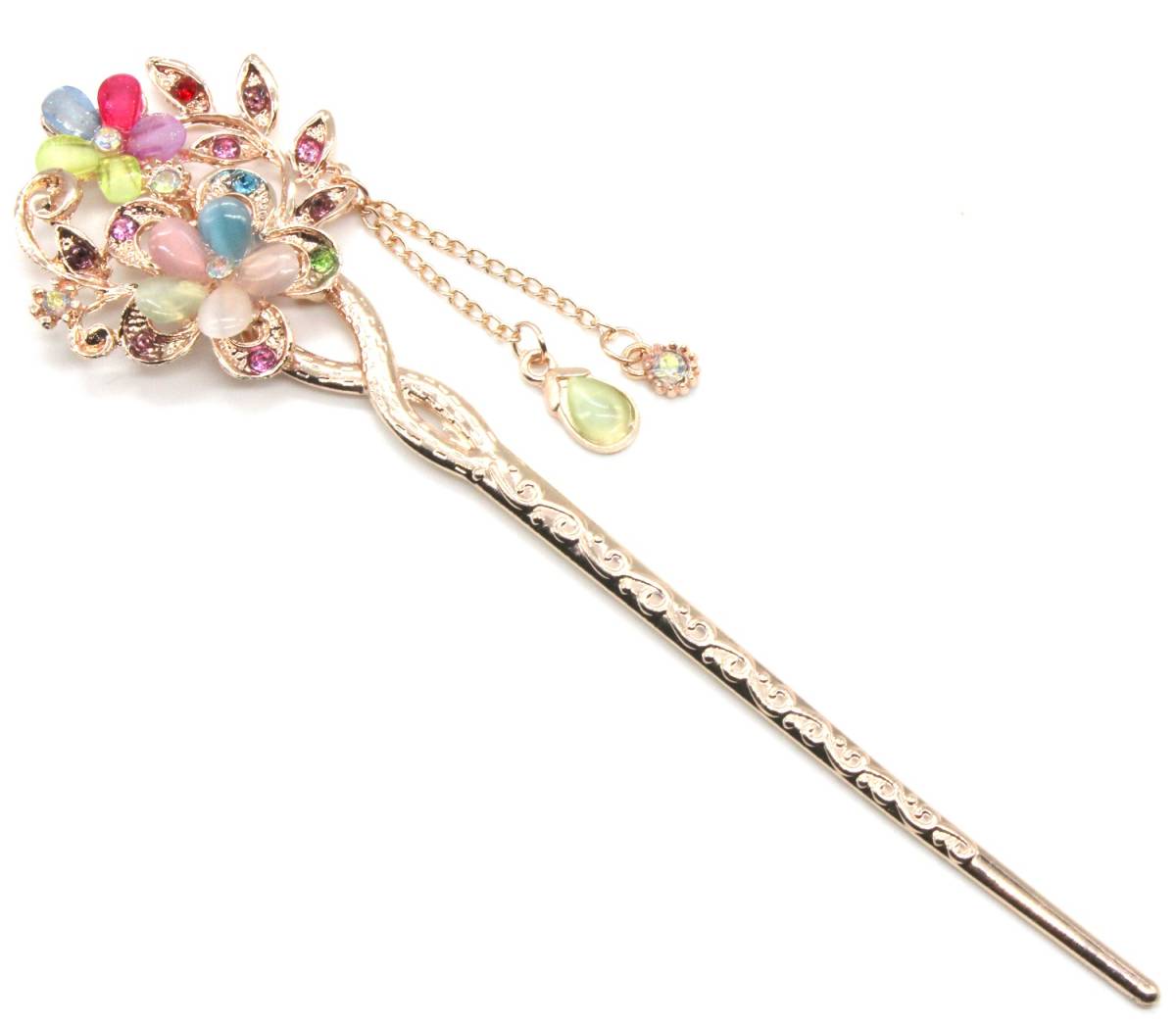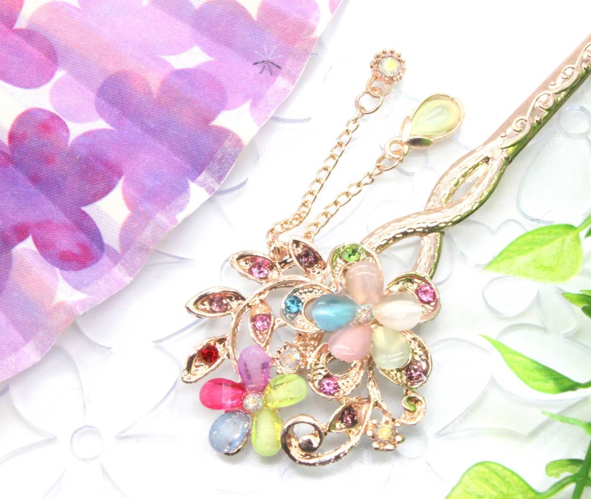 かわいい おしゃれ かんざし 一本 髪飾り ピンクゴールド マルチ カラー カラフル フラワー 桜 花 振袖 留袖 浴衣 ヘアー アクセサリー 新