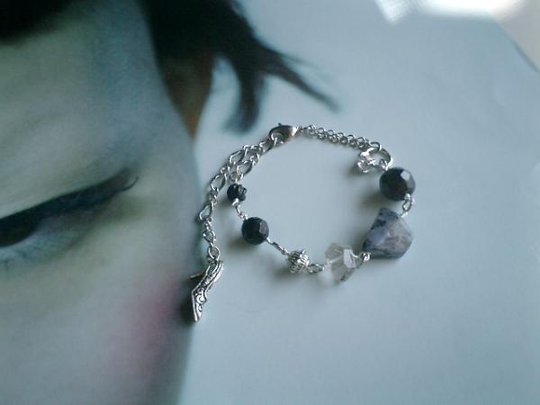 ロマンチック・ロマンチックシリーズです♪オニキスとブラックルチルの可憐なブレスレットです!繊細でモダンな素材を合わせてアンティークな雰囲気です♪巴里の裏町をイメージして作りました♪オニキスは10ミリ、8ミリのラウンドカットと6ミリのSラインです♪ブラックルチルクォーツは11ミリ位のラフカットです♪ジルコニアのリングや繊細な模様の13×16ミリ位のデンドライトアゲートを合わせて神秘的な表情です♪長さは全長22センチ位で調節自由です♪シンプルで飽きのこないいつまでも着けられるデザインを考えて作りました!お揃いのネックレスも出品しています♪ハンドメイドをご理解頂いてノークレーム、ノーリターンでお願いします