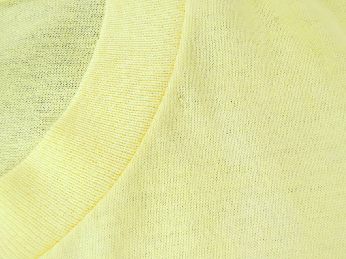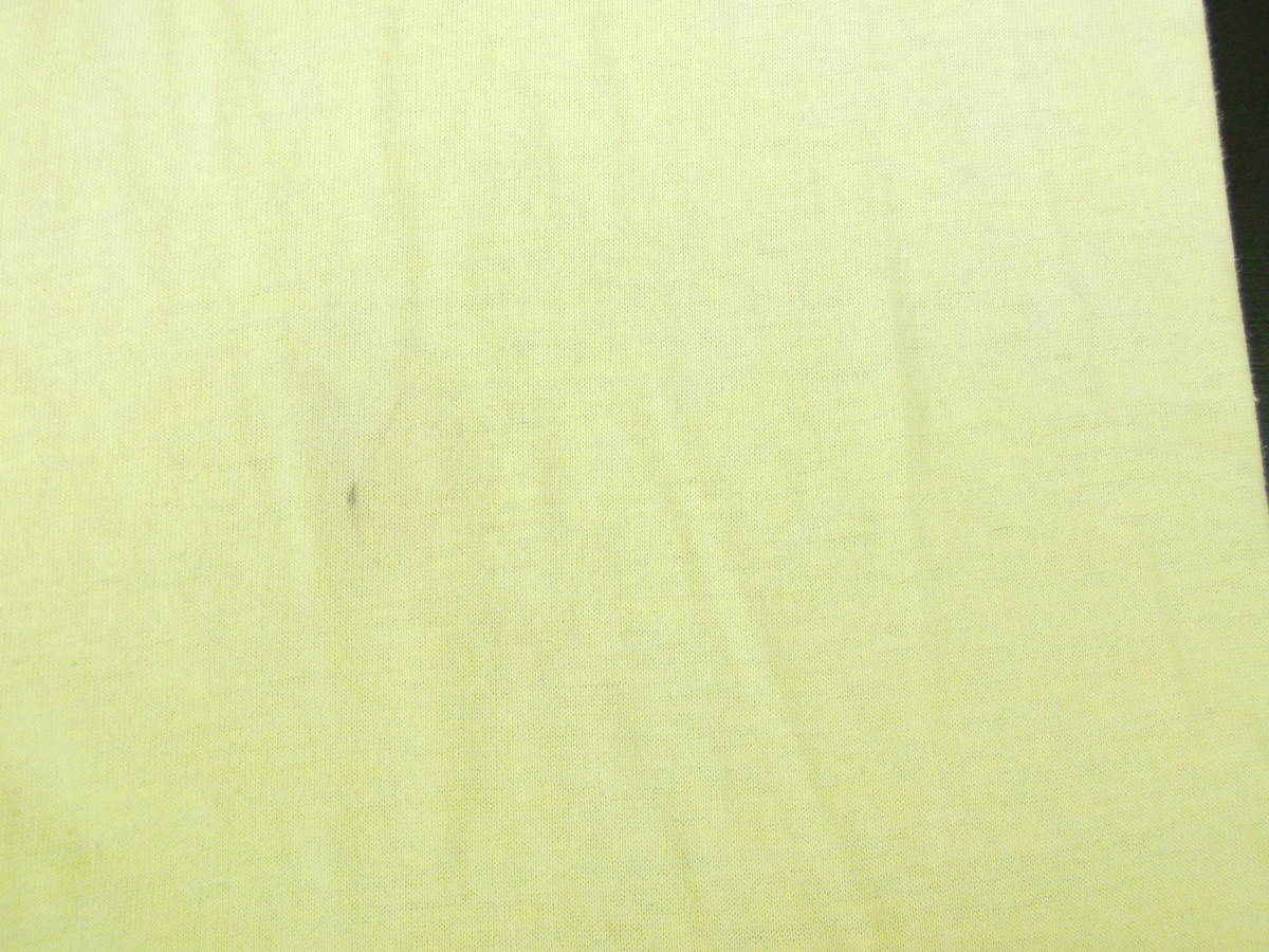 洗濯済みですがUSED品のため着用感があり、全体的にうっすらと色むらがあり、フロント下、左袖付け根に画像のような小さなシミがあります。また、襟リブ近くに1mm位の小穴が1個あります。