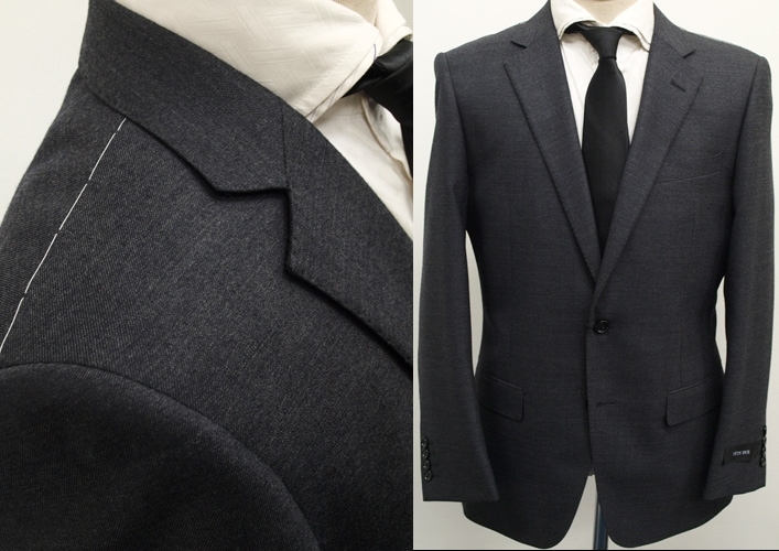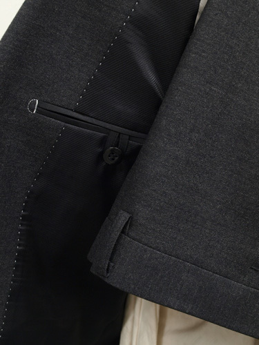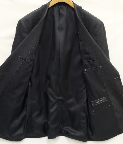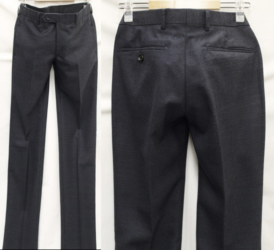 【サイズ】 AB5 (ABM号相当) 目安の体型 身長165cm~175cm、ウエストサイズ86cm前後 【ジャケット実寸】 肩幅46cm 着丈69.5cm 袖丈60.5cm 脇下部分52cm 身幅47cm 【パンツ実寸】 ウエスト(胴回り実寸)86cm (平置きでかるくはかると86cmでひっぱってはかると88cmです。股上が浅いため2cmほど大きめに作られております。) わたり幅32.5cm(股下10cmの部位で28.5cm) 裾幅19.7cm 脇股上23cm 前股上26cm 股下90cm(裾上げしていない状態/新品) 【素材】 表地:ウール(毛)50% ポリエステル50% 裏地:胴裏/ポリエステル100% 袖裏/ポリエステル100% 適度な厚みの秋冬向け紳士スーツ用のウールブレンド素材を使用 【色】 チャコールグレー 【柄】 杢調無地 【デザイン】 着丈が短めで、ウエストや腕部分などすっきりとしたコンパクトな印象の細身シルエット、タイトフィットスリム、ビジネススーツ新品、裾上げしていない状態です。 ・ジャケットはシングル2つボタンでスリムモデル ・パンツは股上が浅く細いシルエットのノータックスリムテーパードパンツ 着た感じ、見た目は細身ですっきりシルエットに見えますが、肩パットも薄く柔らかめを使い、極端に腕まわりを細くしていないので、それほど窮屈感はありません。 秋~冬~春先にかけて秋冬シーズン対応商品です。 ブランド名 TETE DUE/KAZUTAKA KATOH 【縫製仕様】 ・ジャケットはシングル2つボタン、ノッチドラペル、襟元等AMFステッチ入り、袖口ボタン4つ、センターベント、内ポケット4つ(小ポケット2つ含む)、総裏(秋冬物) ・パンツはノータック、膝裏当て付き、脇ポケット斜め付け、後ろポケット両玉縁で左のみボタン付き、フロントはファスナーでボタン&ホック仕様/うちかけボタンあり 細部にわたりきちんとしたきれいな縫製仕立てで仕上がっております。