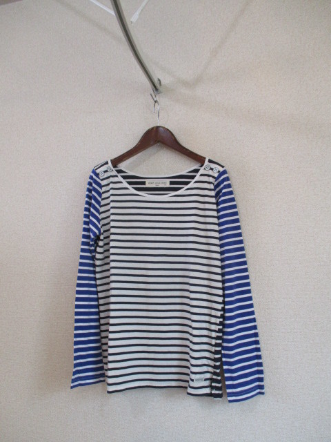 | 商品紹介 | 違う色合いの生地を使ったボーダーカットソーです。 両肩に付いたボタンがアクセントになっています。 前身頃は白地にネイビーのライン、後ろはネイビーの地色に白いライン、 袖はブルーに白いラインのボーダーです。 両サイドの裾に数センチ、スリットが入っています。 《素材》 コットン100% |