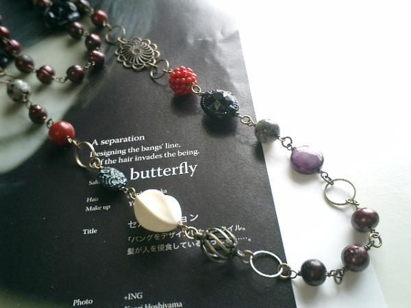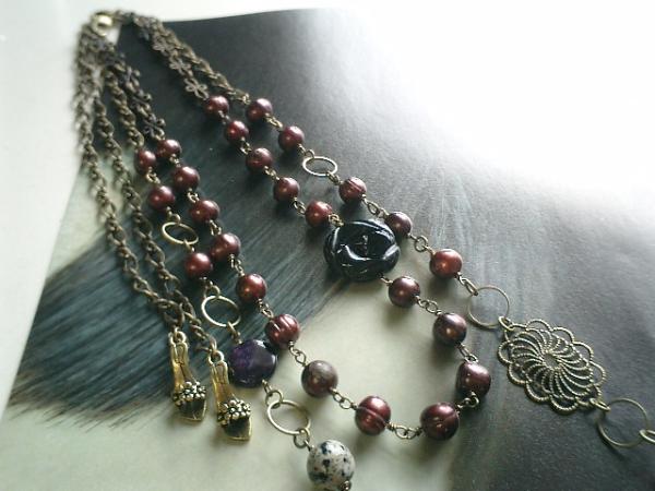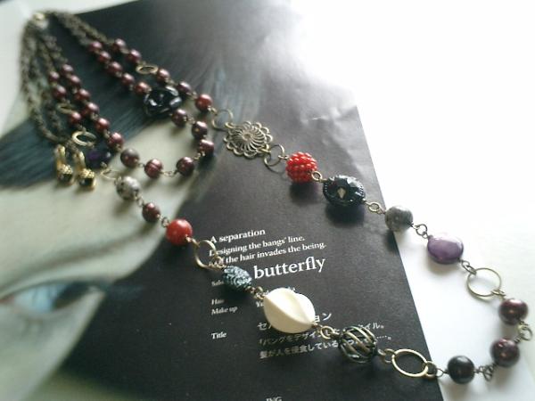 巴里・マチルダシリーズです♪ロマンチックを見つけて!異素材ネックレスとシックなダークレッドの淡水パールのネックレス2点セットです♪♪シックに華やかにまとめました♪アンティークな雰囲気です♪巴里の裏町をイメージして作りました♪淡水パールは8ミリから9ミリ位のポテトでブラックオブシディアンの薔薇は20ミリ位です♪お花のチェーンを合わせてひっそりロマンチックしています♪長さは全長60センチ位で調節自由です♪チョーカー風にしたりブレスにしても可愛いです♪色々な異素材のネックレスはアンティークのチャームや10ミリ位の珊瑚玉やダルメシアンの丸玉や10ミリのパープルアゲートのコインやヴィンテージビーズやスポンジ珊瑚の丸玉や淡水パールを合わせてシックで華やかです♪長さは全長89センチ位で調節自由です♪2連にしたりブレスにしても可愛いです♪2本一緒にネックレスにしても片方をブレスにしても可愛いです♪いろいろな組み合わせでお楽しみいただけます♪シンプルで飽きのこないいつまでも着けられるデザインを考えて作りました!お揃いのブレスレットも出品予定です♪ハンドメイドをご理解頂いてノークレーム、ノーリターンでお願いします