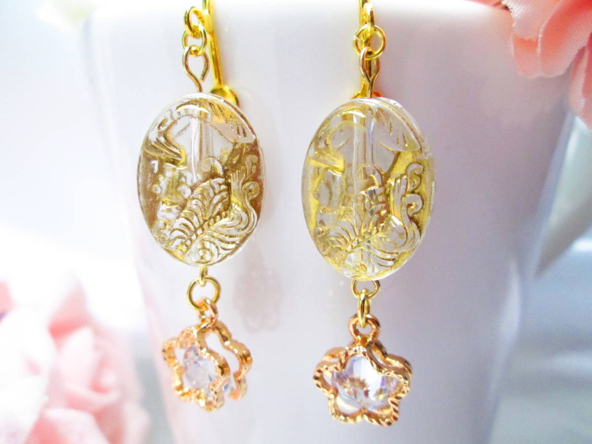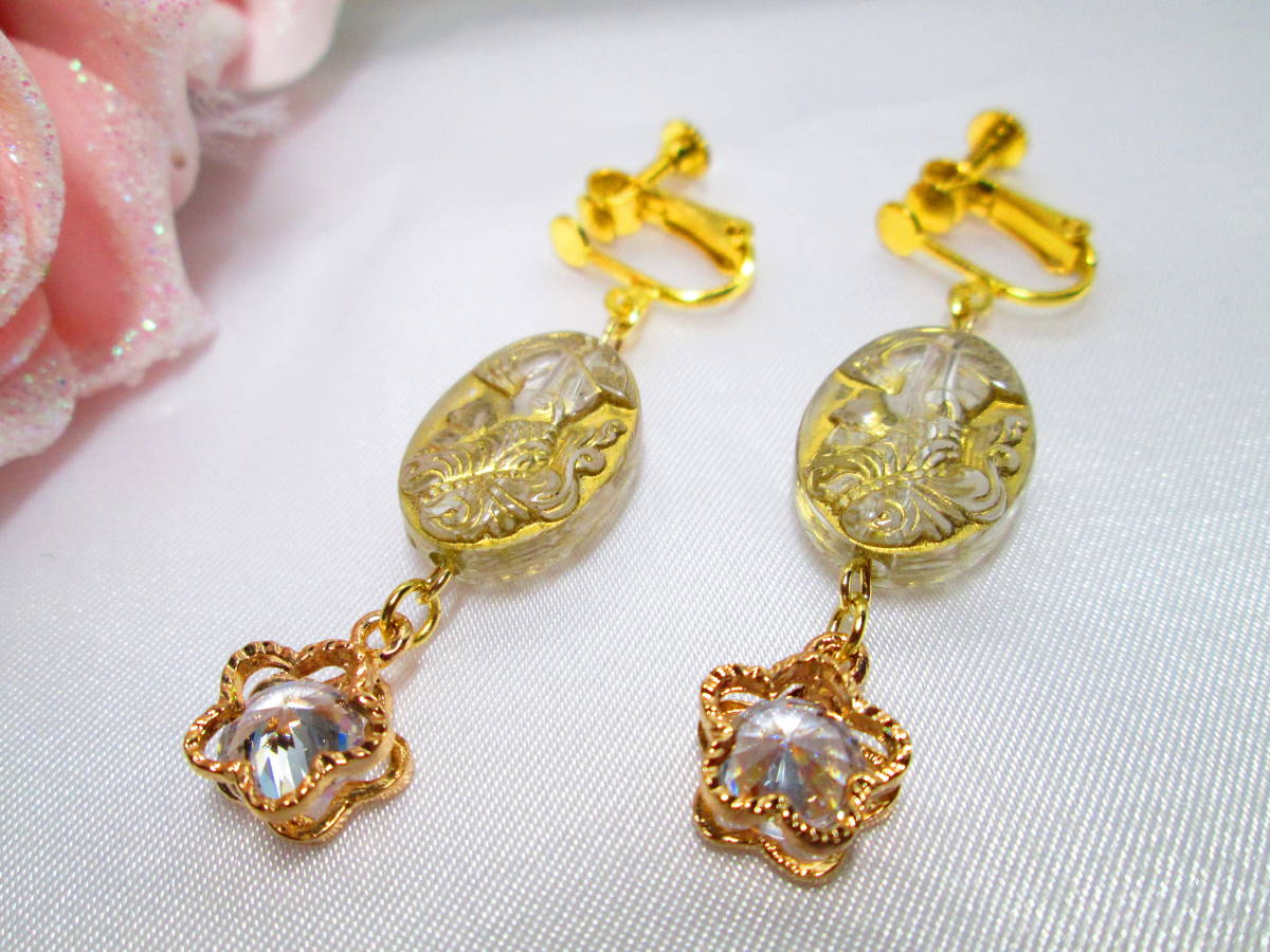 ★商品内容★ ★エスニックビーズとクリスタルチャーム花形のハンドメイドイヤリング★クリスタル・エスニック・花・ゴールド・ゴージャス・上品 大き目のエキゾチックなビーズが印象的な 大人の雰囲気のイヤリングです・**。*.・**。 クリスタルゴールドの花形チャームがキラキラ揺れて、 ゴージャスで上品な女性らしさを印象付けます*。・*。・*。・*. 普段使いはもちろん、オフィスにも お出掛けやお洒落のワンポイントにも最適です.・**。・**。 【素材】 エスニック調ビーズ18mmx12mm クリスタルゴールドフラワー10mmx5mm カンより垂れ下がる長さは、約3.8㎝ Eー373 Pー82 ★商品状態★ ・画像と実物の色味が多少異なる場合があります。 ・緩衝材(プチプチ等)を使用し、防水梱包でお届け致します。 ★注意事項★ ***~ご購入前に必ずお読み下さい~*** ***商品について*** *一点一点心を込めて作っておりますが、手作りなため多少の歪み等あるかもしれません。 手作りの味わいと、世界で一つだけの作品とお考えいただければ幸いです。 *デリケートな商品ですので、強く引っ張ったりすると破損する事もあります。 お取り扱いにはご注意ください。 *写真も完璧な色合いの表現にはなっていない場合もあります。 *基本イヤリング金具は跳ね上げ式ネジ付きを使って作成しています。 ご希望によりピアスへの変更も承っております【フックピアスへの変更(無料)/キャッチピアスへの変更(別途追加料金120円)】 ~ご注文の際にメッセージ欄よりお申し付けください~ 尚、金具変更のご希望が無い場合は、掲載された写真の金具にてお送り致します。 *金属アレルギーへの対応はしておりませんので、ご心配な方はご遠慮下さいますようお願い致します。 *永くご愛用頂くために、ご使用後は柔らかい布等で軽く拭いてください。 ***ご質問について*** *ご購入前にお願い致します。 日中は仕事をしておりますので、ご返事が直ぐに出来ない場合がございます。 出来る限り早い対応を心がけますが、ご了承ください。 また、発送までには、お振込み確認後、翌日の発送を心がけておりますが、仕事の都合により2~3日程かかる場合がございます。(その際にはナビにてご連絡いたします) お急ぎの場合は、極力対応いたしますが、場合によっては対応致しかねる事もあります。ご了承下さいませ。 落札後4日以内にお手続き、ご連絡が無い場合は落札者都合で削除致します。 発送日指定・ご入金の予定が1週間以上先をお考えの方は、入札の前に質問よりご連絡くださいませ。 予めご了承の上、ノークレーム・ノーリターンでお願い致します。 | |||