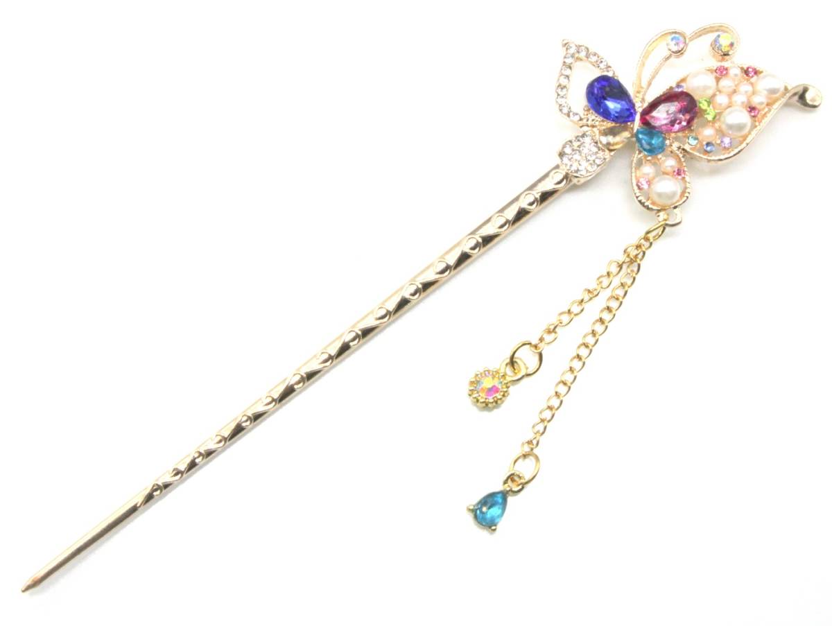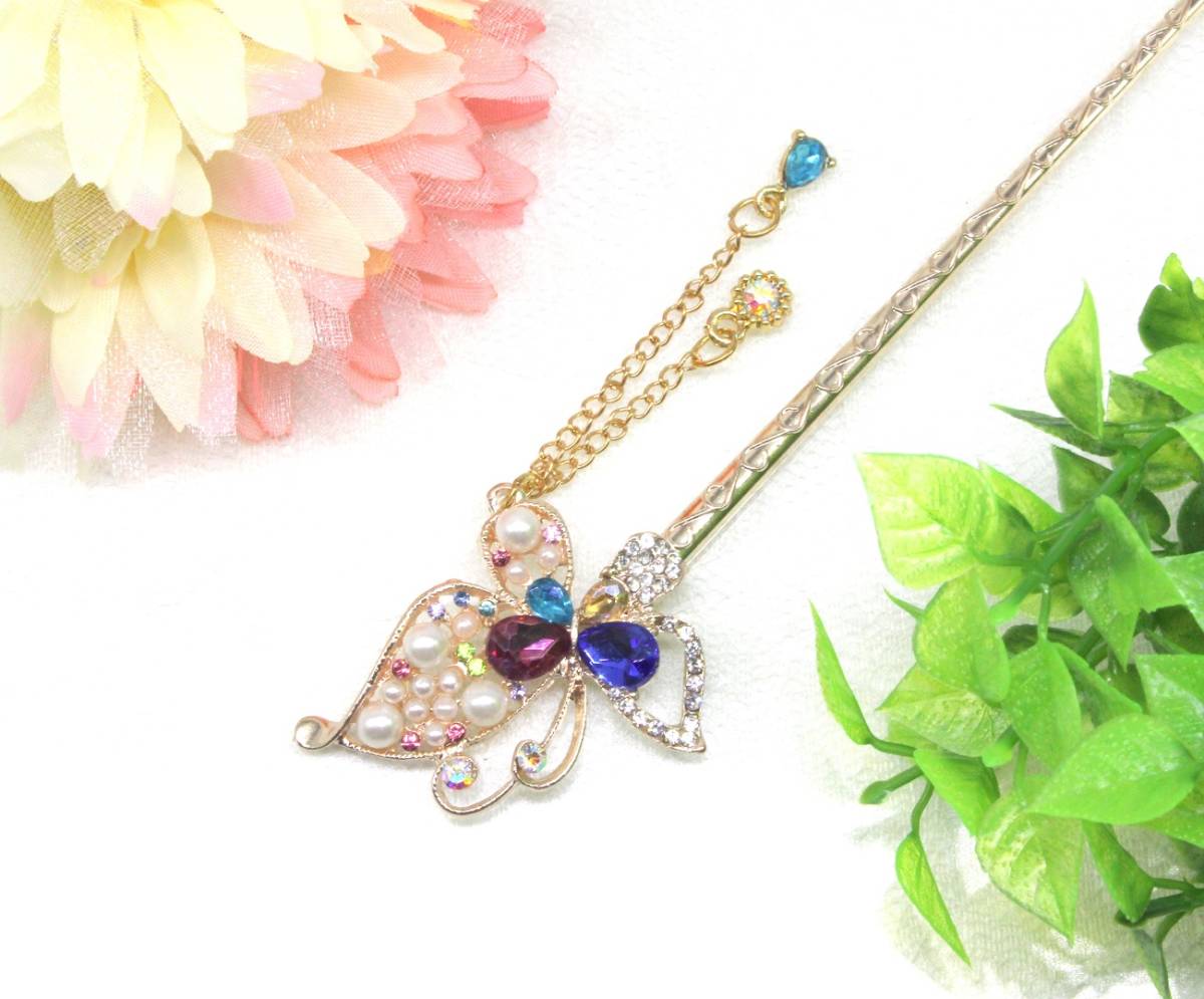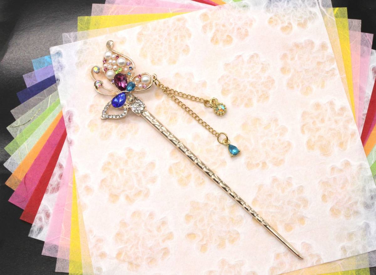 大人気 バーゲン セール レア キュート お買い得 超特価 新品 未使用 かわいい おしゃれ 人気 限定 商品 オリジナル オンリーワン あなたの新たなヘアスタイルにワンポイントヘアアクセサリー 着物やドレス、 振袖、 留袖で充分活躍してくれます。 ヘアアクセとしてキラキラ輝いて、おしゃれでかわいい一本簪です パーティー、 結婚式、送別会、二次会、女子会、婚活、恋活、合コン、デート、歓迎会、お花見、成人式、入学式、卒園式、卒業式、入園式、謝恩会、ウェディング、ブライダル、コスプレ、お呼ばれ、お水のお仕事、訪問、日本舞踊、ダンス、キャバ嬢、演奏会、音楽会、披露宴、旅行、リゾート、華道、茶道、祭、コンサート、ダンス、等で、幅広く活躍してくれるかんざしです ☆彼女、奥様、妻、嫁、友人、親友の記念日、誕生日、大切な日へのプレゼントとしてもご使用できます。 ☆☆若い女性から40代以上の女性からもご購入されている人気商品です。   晴れの舞台でお母様のヘアアクセサリーのワンポイントとしても数多く、ご購入されて、お喜びの声をいただいていますよ。 ◆ピンクゴールドのヘアスティックに人気モチーフのちょうちょが羽ばたいてるスタイルを表現し、日本の和の伝統美を演出しています。 ◆一本軸のかんざしは巻いて留めても、お団子に挿したりして、魅力的なヘアアレンジでさりげなく注目度・好感度アップ ◆洋服やカジュアルの時や和服や浴衣の和装の時の、あげ髪やまとめ髪、夜会巻に1つあれば大活躍してくれます。 ◆セミロングやロングヘアの女友達や恋人、彼女、奥様へのプレゼント、自分へのご褒美のへアクセサリーとして最適です。 ◆サイズ:15.5㎝×4.0㎝ チェーン飾り1本(5.5㎝)と1本(3㎝) 重量:336g 素材:合金、ラインストーン ◆和装小物、黒留袖、長襦袢、きもの、羽織、袴、浴衣、と併用してご使用いただくと注目度・好感度を高めてくれます。 【注意】 変色防止の為、水や汗に濡れた場合、優しく拭きとってください。使用していない時は、直射日光を避け保存をお願いいたします