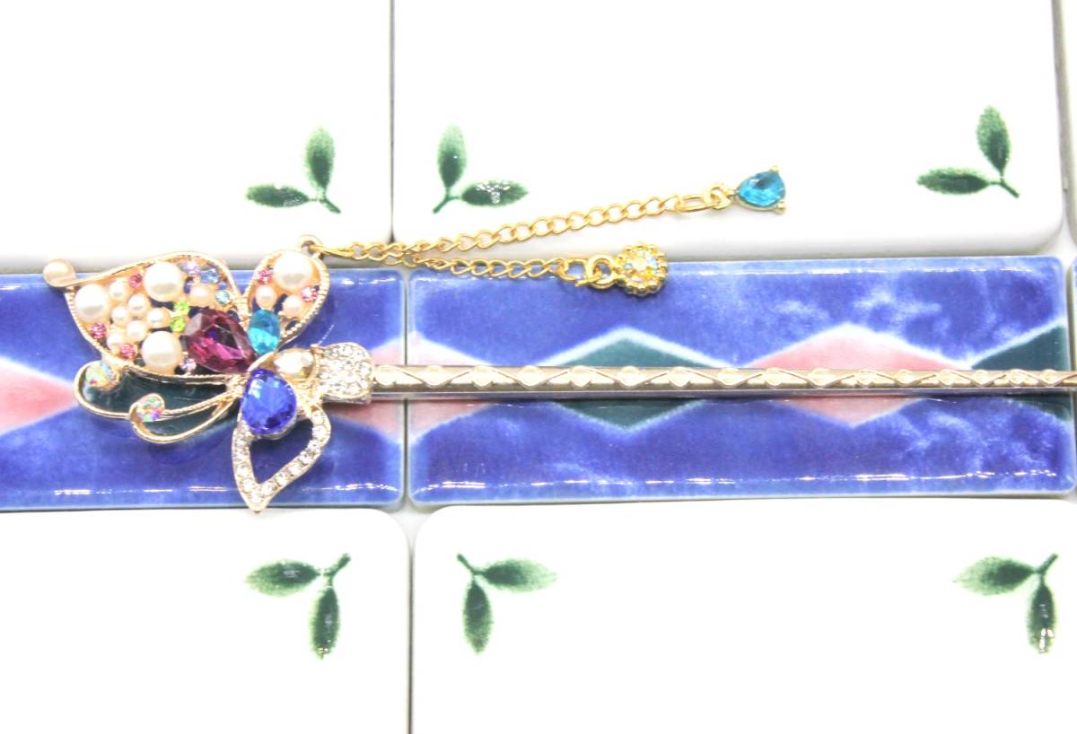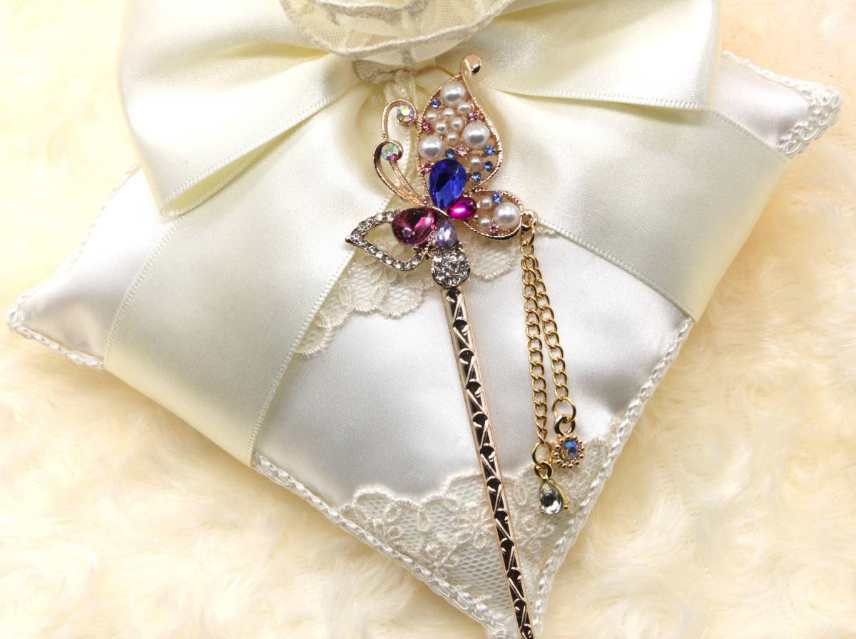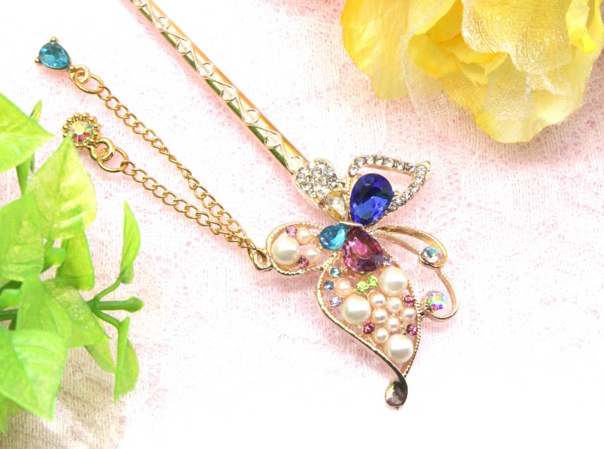 大人気 バーゲン セール レア キュート お買い得 超特価 新品 未使用 かわいい おしゃれ 人気 限定 商品 オリジナル オンリーワン あなたの新たなヘアスタイルにワンポイントヘアアクセサリー 着物やドレス、 振袖、 留袖で充分活躍してくれます。 ヘアアクセとしてキラキラ輝いて、おしゃれでかわいい一本簪です パーティー、 結婚式、送別会、二次会、女子会、婚活、恋活、合コン、デート、歓迎会、お花見、成人式、入学式、卒園式、卒業式、入園式、謝恩会、ウェディング、ブライダル、コスプレ、お呼ばれ、お水のお仕事、訪問、日本舞踊、ダンス、キャバ嬢、演奏会、音楽会、披露宴、旅行、リゾート、華道、茶道、祭、コンサート、ダンス、等で、幅広く活躍してくれるかんざしです ☆彼女、奥様、妻、嫁、友人、親友の記念日、誕生日、大切な日へのプレゼントとしてもご使用できます。 ☆☆若い女性から40代以上の女性からもご購入されている人気商品です。   晴れの舞台でお母様のヘアアクセサリーのワンポイントとしても数多く、ご購入されて、お喜びの声をいただいていますよ。 ◆ピンクゴールドのヘアスティックに人気モチーフのちょうちょが羽ばたいてるスタイルを表現し、日本の和の伝統美を演出しています。 ◆一本軸のかんざしは巻いて留めても、お団子に挿したりして、魅力的なヘアアレンジでさりげなく注目度・好感度アップ ◆洋服やカジュアルの時や和服や浴衣の和装の時の、あげ髪やまとめ髪、夜会巻に1つあれば大活躍してくれます。 ◆セミロングやロングヘアの女友達や恋人、彼女、奥様へのプレゼント、自分へのご褒美のへアクセサリーとして最適です。 ◆サイズ:15.5㎝×4.0㎝ チェーン飾り1本(5.5㎝)と1本(3㎝) 重量:336g 素材:合金、ラインストーン ◆和装小物、黒留袖、長襦袢、きもの、羽織、袴、浴衣、と併用してご使用いただくと注目度・好感度を高めてくれます。 【注意】 変色防止の為、水や汗に濡れた場合、優しく拭きとってください。使用していない時は、直射日光を避け保存をお願いいたします