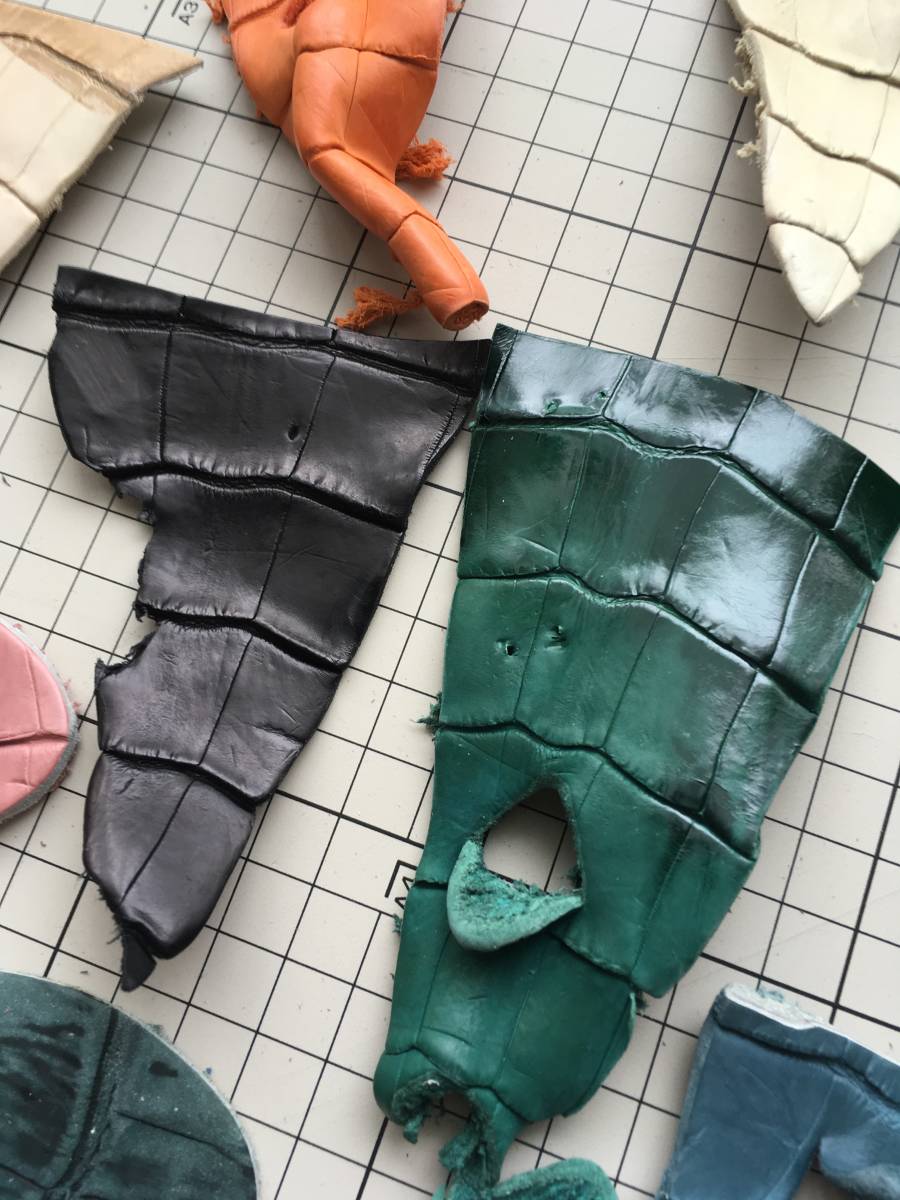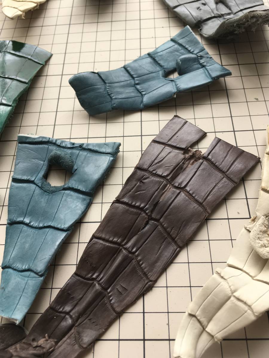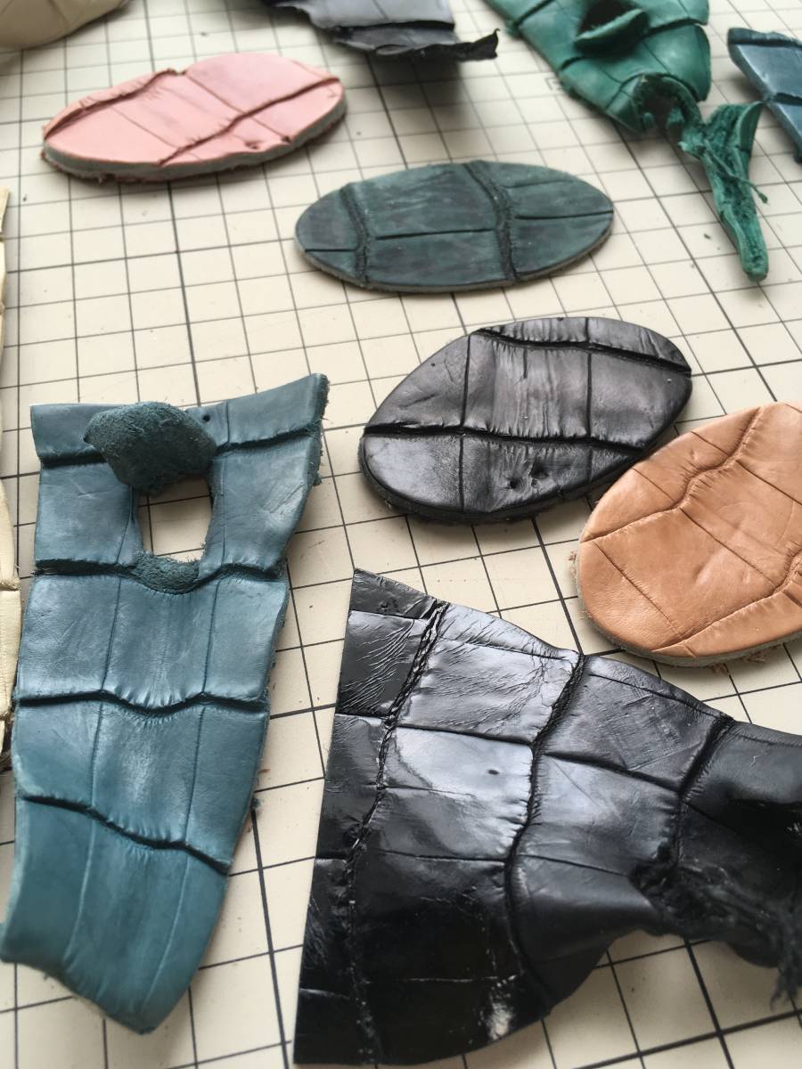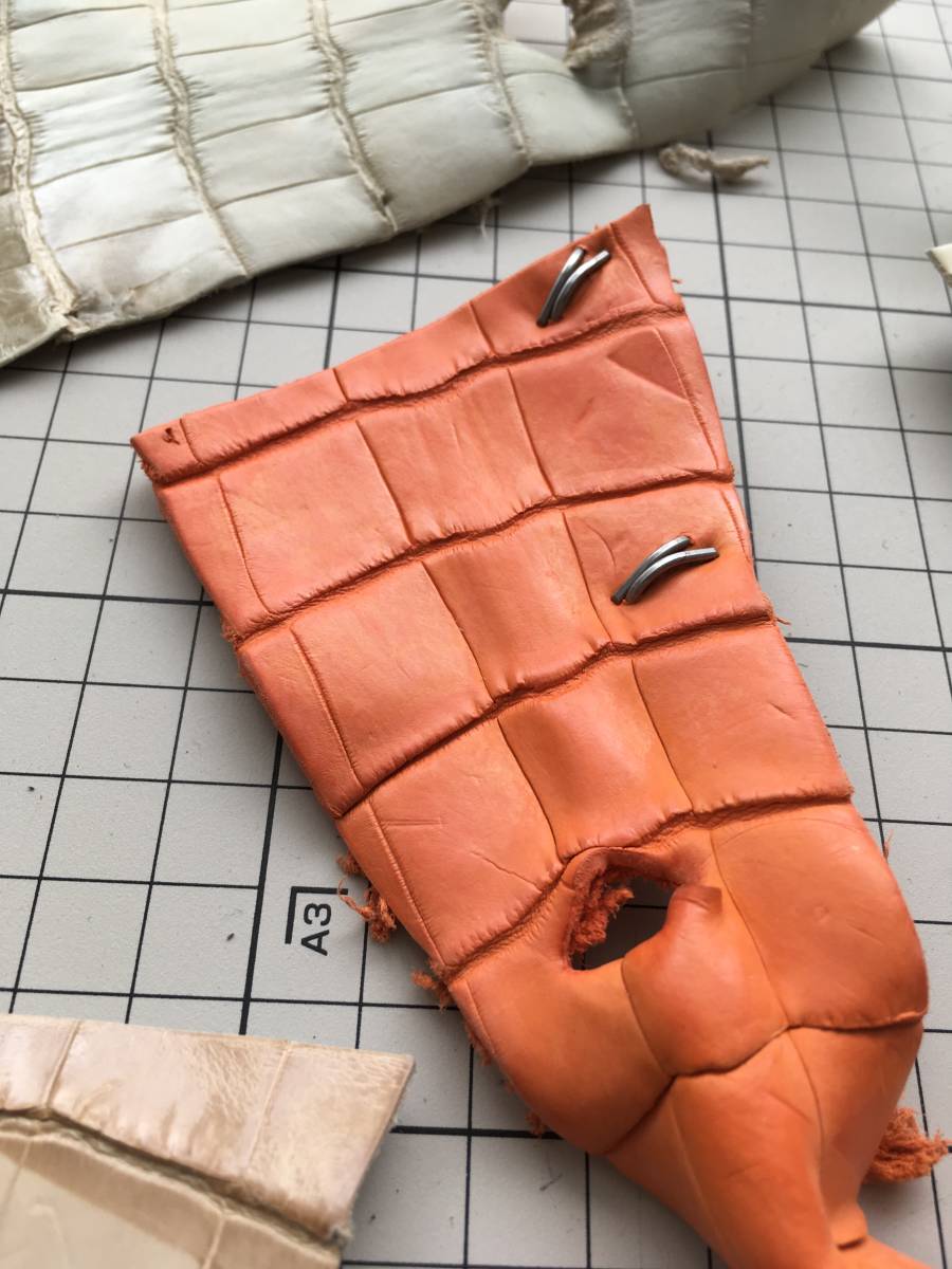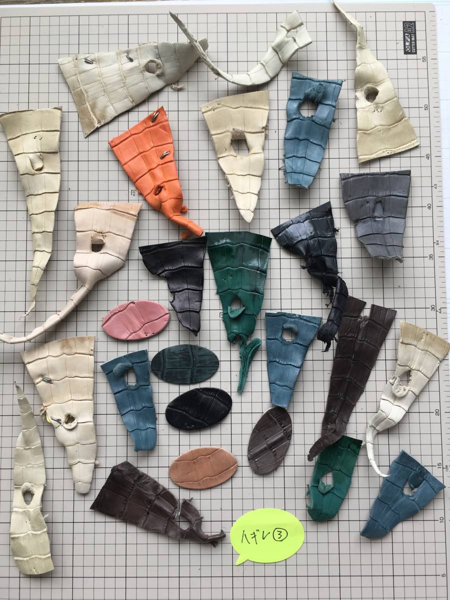 クロコダイルのハギレセットです。レザークラフトのパーツ取り、小物作りにどうぞ。本体裁断後未使用になります。皮革につき、染めムラ、傷などある場合がございます。穴、表面傷アリ。写真ではなるべく広げていますが、