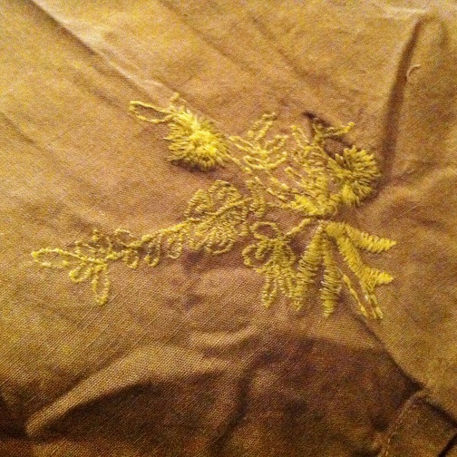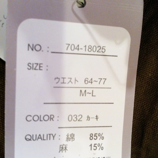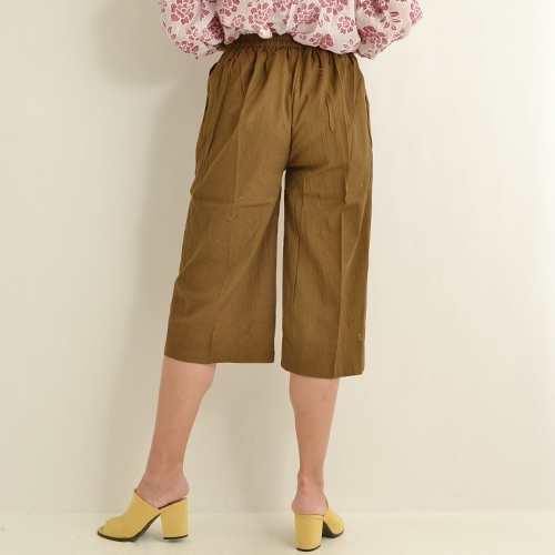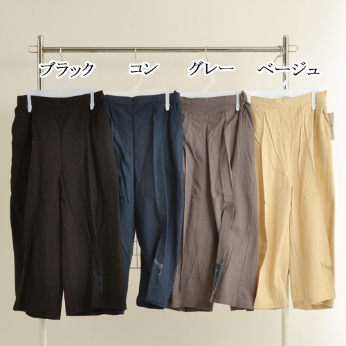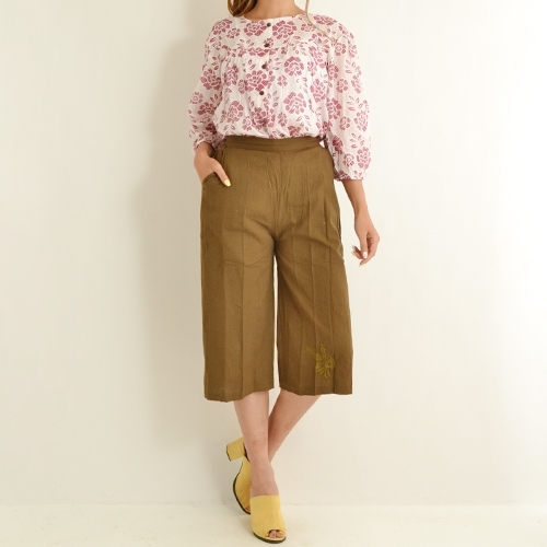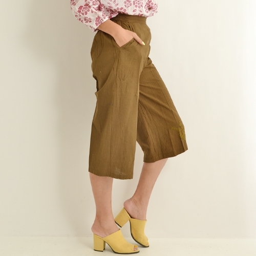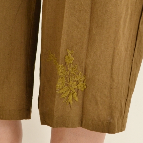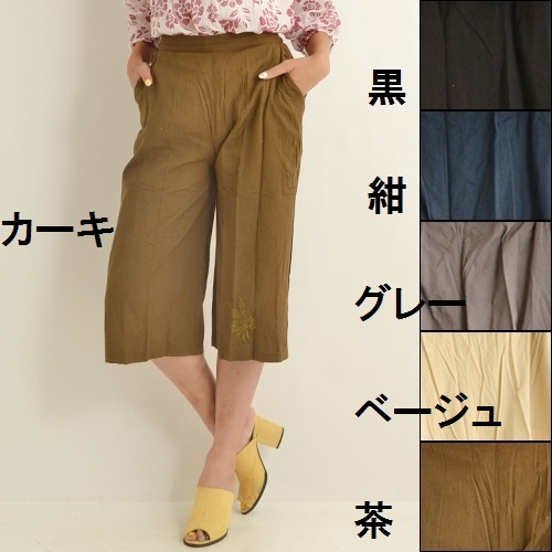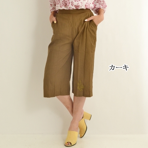 夏物新品☆綿麻混ワンポイント刺繍 膝丈ワイドパンツKHカーキ キュロットガウチョパンツ ウエストゴム サイドポケットあり インド製