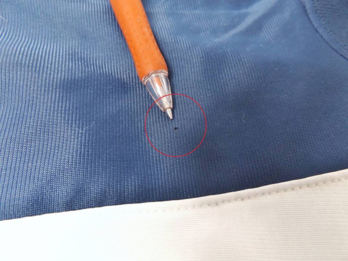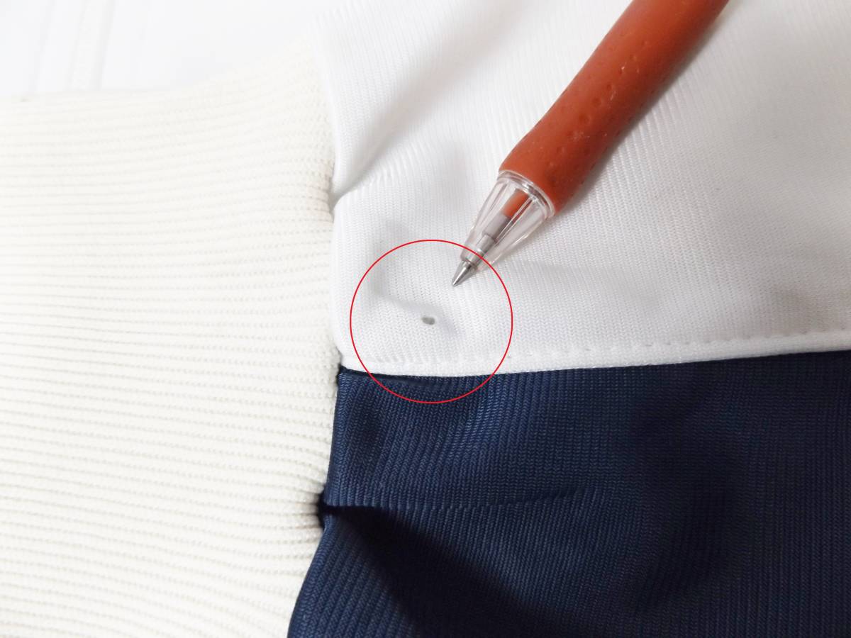 状態は、1mmほどの小さな穴が2ヶ所と左袖口の薄シミ、ボディーの細かい薄シミなどがあり、全体的に使用感はありますが、前述以外の大きく目立った汚れやダメージ、キズはありません