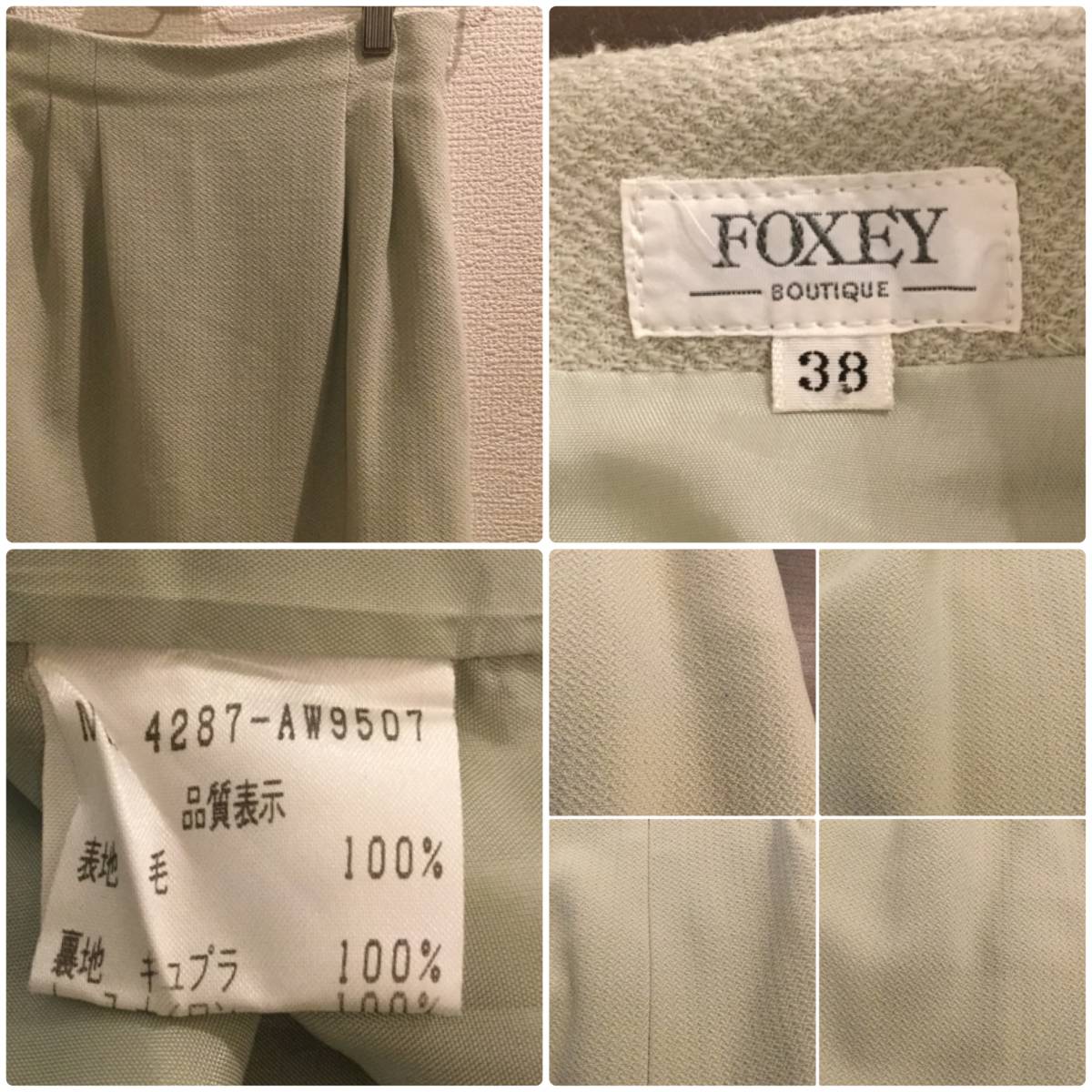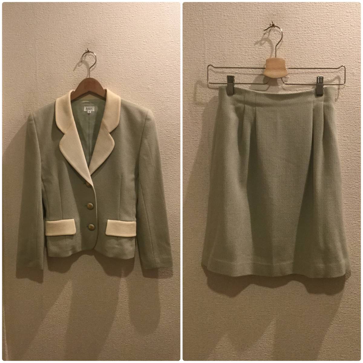 カラーはライトグリーン×ホワイト系、素材は表/ウール100%、裏/キュプラ100%になります。