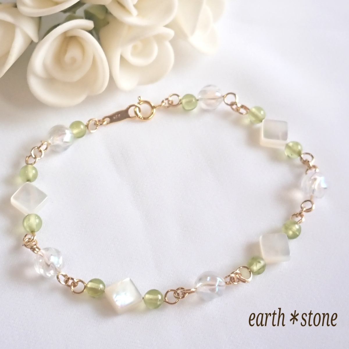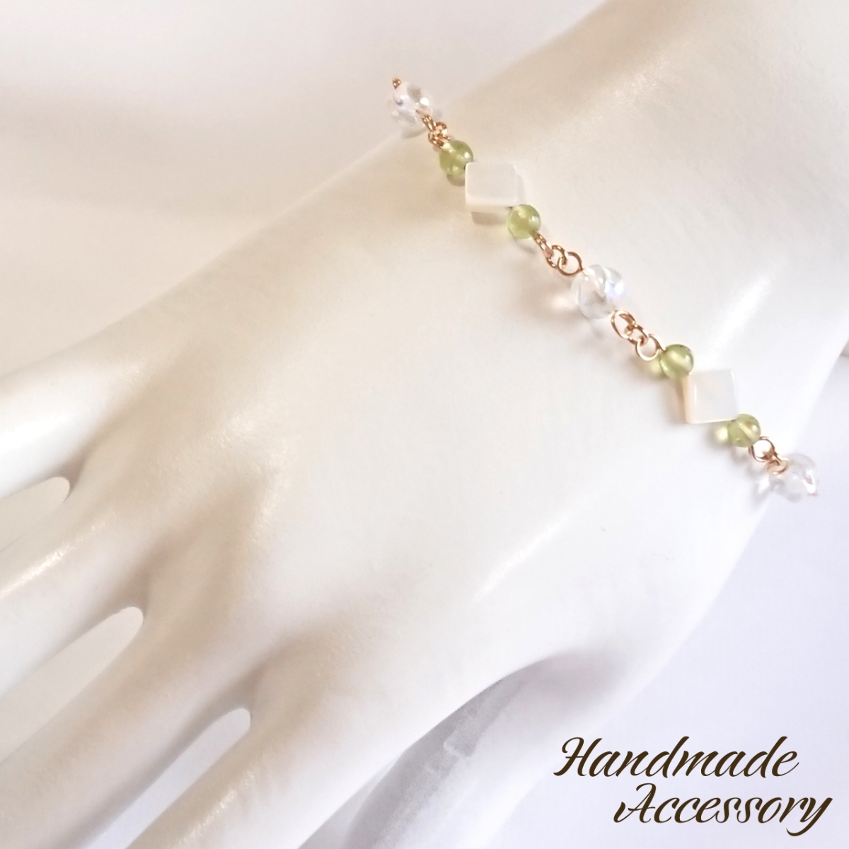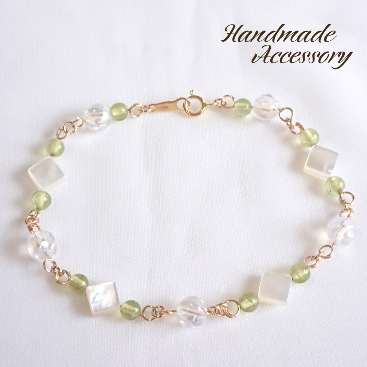 Sラインツイストのアクアクリスタルとダイヤカットのホワイトシェルと小粒のペリドットを18KGP素材のヒキワとプレートと組み合わせた爽やかなデザインのブレスレットです。