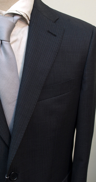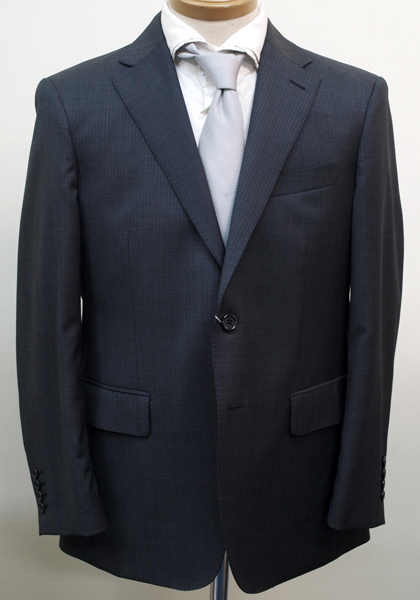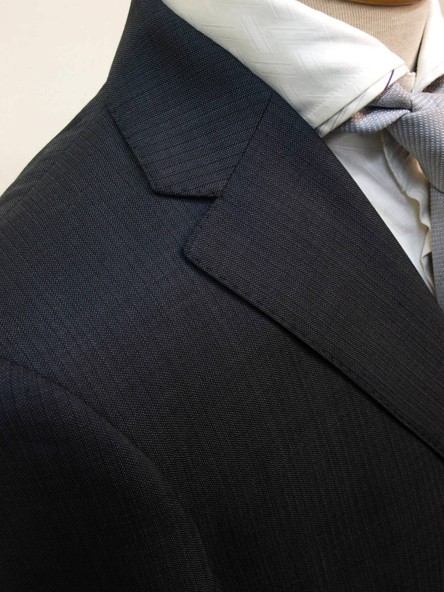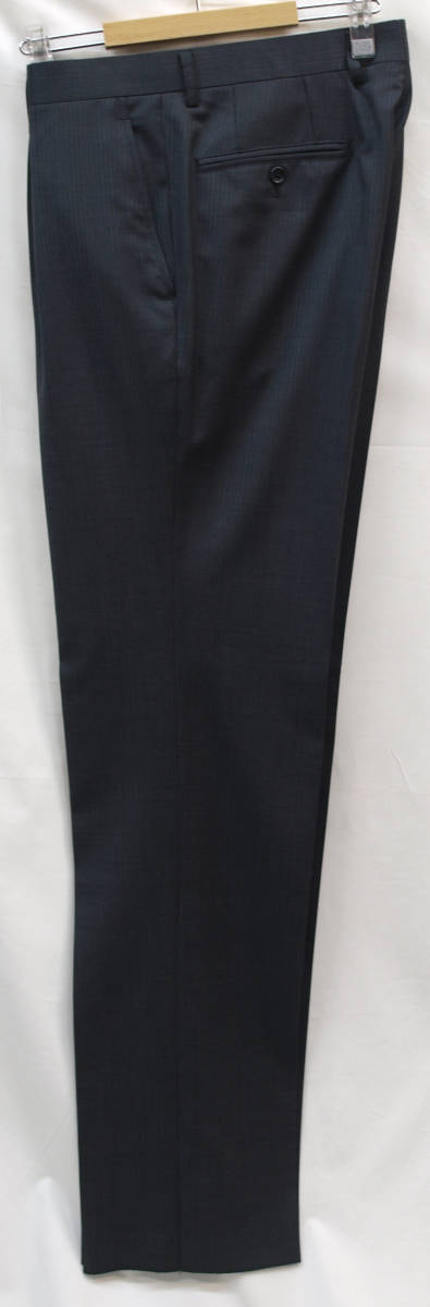 【サイズ】 BB4 (BE4、BBS号相当) 目安の体型 身長160cm~170cm、ウエストサイズ92cm前後 【ジャケット実寸】 肩幅46.5cm 着丈68.5cm 袖丈58cm 脇下部分54.5cm 身幅52cm 【パンツ実寸】 ウエスト(胴回り実寸)92cm わたり幅36cm 股下10cm部分32cm 裾幅23.2cm 脇股上28cm 前股上30.5cm 股下88cm(裾上げしていない状態/新品) 【素材】 表地:ウール(毛)100% 裏地:胴裏/ポリエステル100% 袖裏/ポリエステル100% ・イタリア、レダ(REDA)社のSUPER110'S生地を使用 高級イタリア製生地特有のしっとりとしたなめらかな触り心地の上質な素材です。 【色】 ダークグレー 【柄】 黒色のラインが4mm間隔で入ったコードストライプ織柄 【デザイン】 細すぎずかといってゆとりがありすぎることなく、体型に無理なくきれいにフィットする、シングル2つボタンスーツ、レギュラーフィット、ビジネススーツ新品、裾上げしていない状態です。 ・ジャケットはシングル2つボタンでレギュラータイプ ・パンツは股上は浅くなくウエストラインで履くタイプで少しだけゆとりをもたせたちょうど良いくらいのすっきりシルエットのワンタックスラックスです。 春夏商材ですがあまりすけ感のないほどよく厚みのある生地を使用した背抜き仕様のスーツで、ご着用の地域にもよりますが真冬を除く春夏秋のほぼオールシーズン対応致します。 メーカー希望小売価格 税込み62640円 【縫製仕様】 ・ジャケットはシングル2つボタン、ノッチドラペル、襟元等AMFステッチ入り、袖口ボタン4つ、センターベント、内ポケット4つ(小ポケット2つ含む)、背抜き(春夏秋物) ・パンツはワンタック、膝裏当て付き、脇ポケット斜め付け、後ろポケット両玉縁で左のみボタン付き、フロントはファスナーでホック仕様/うちかけボタンあり 使用付属(肩パット、毛芯等)もワンランク上のを使い、細部まできれいな縫製仕立てで仕上がっております。