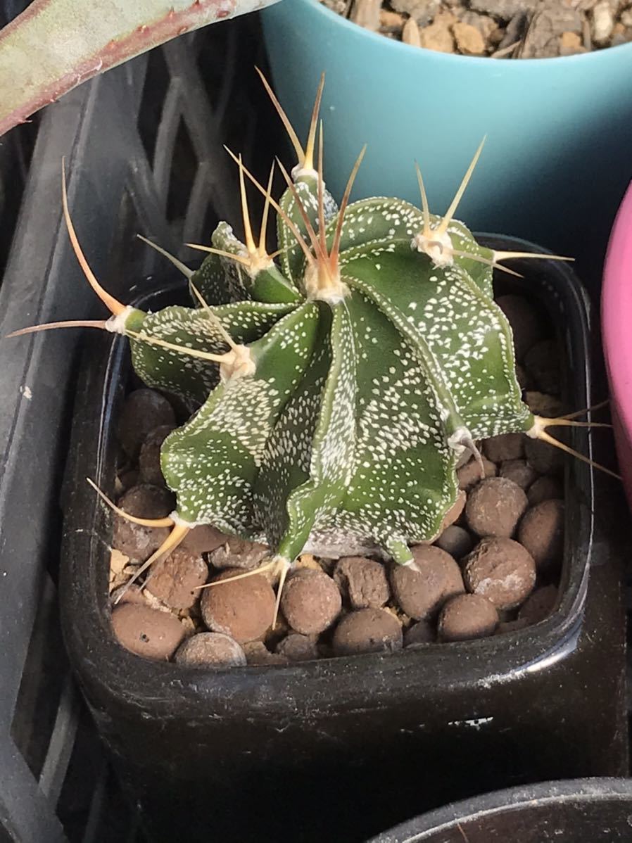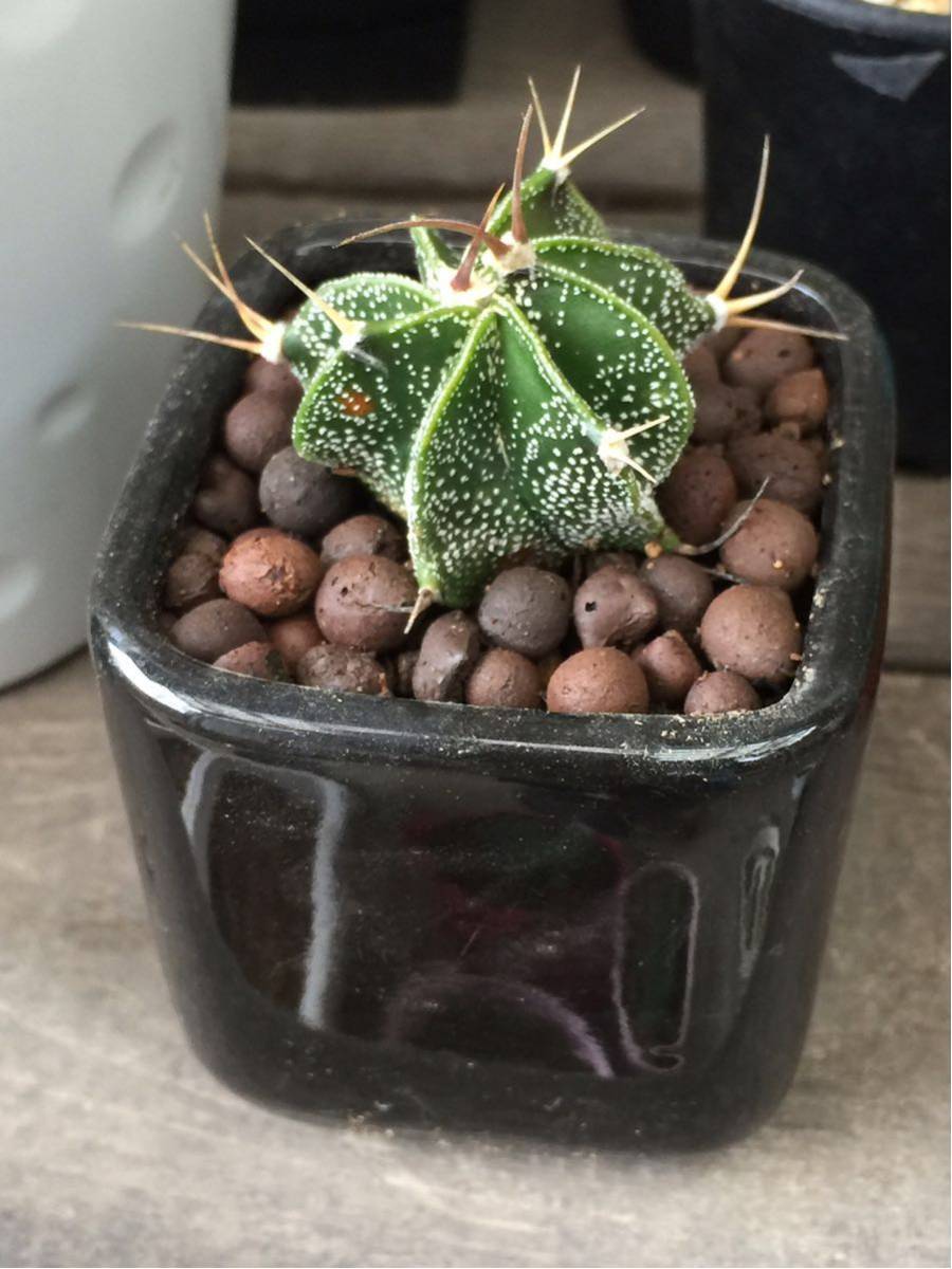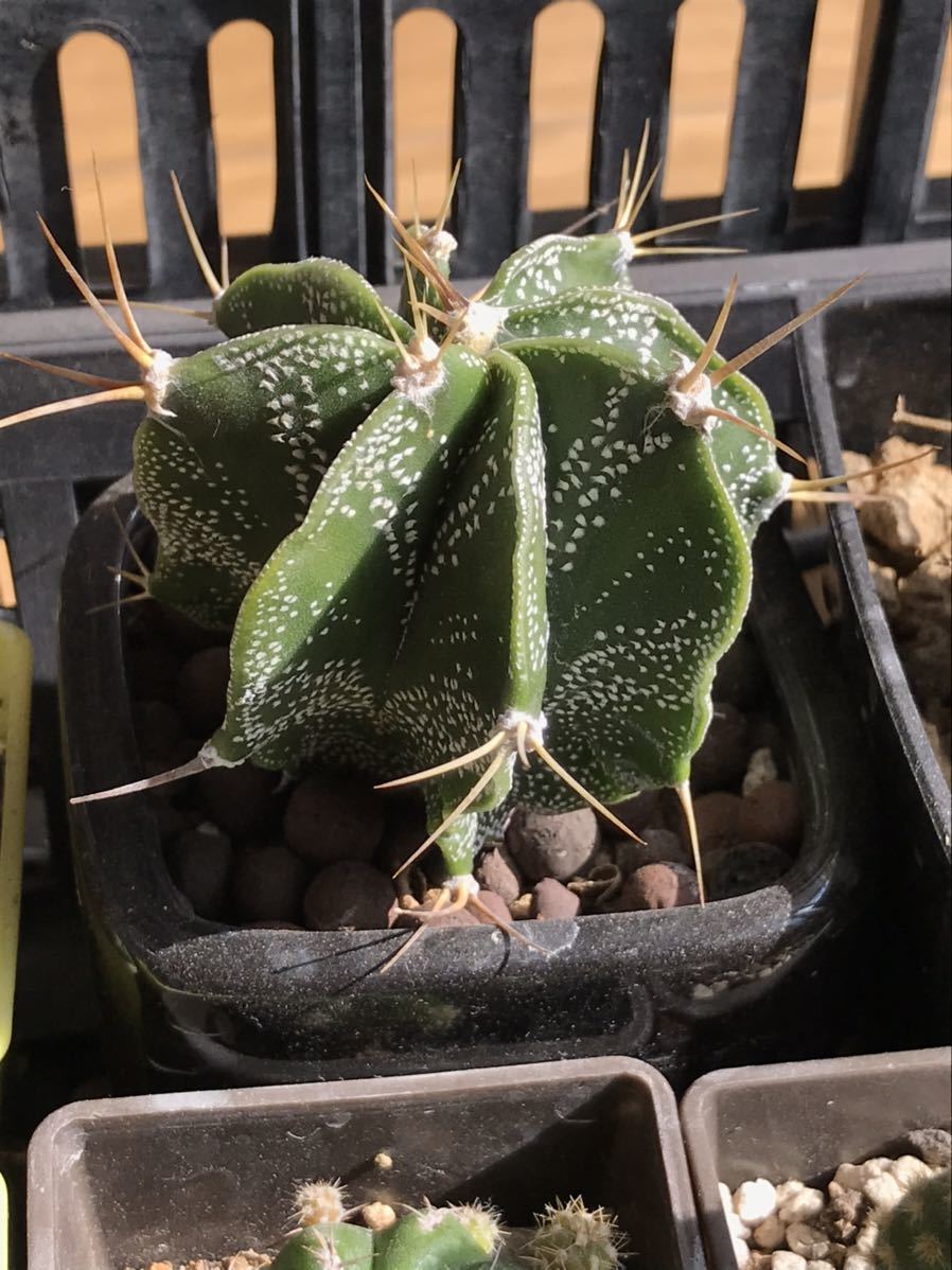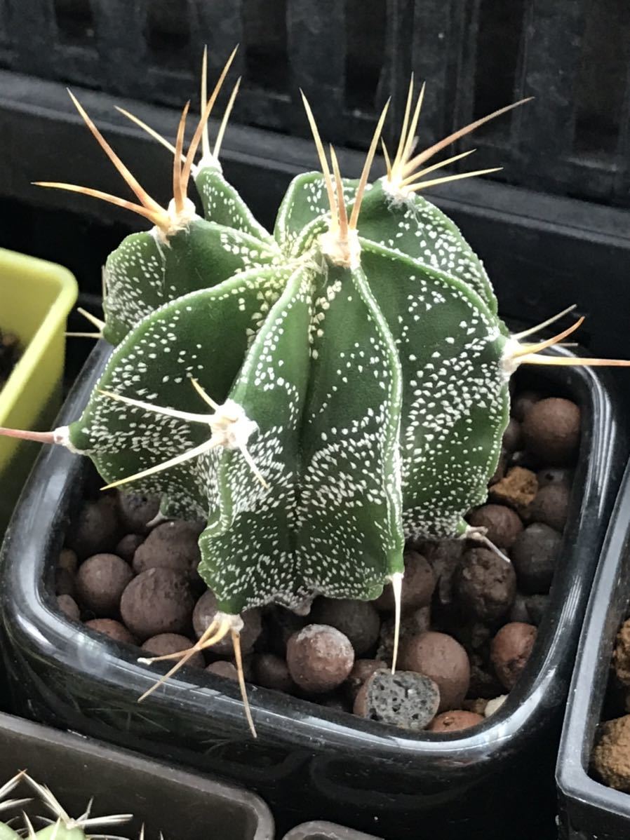 サボテン科アストロフィツム属のサボテンです。縦にトゲを持ち、8本の稜線が入った丸みを帯びた幹をしており、幹肌にまばらに白く細かい斑点を持ちます。ランポー玉などと同じアストロフィツム属ですが、般若は稜線の切れ込みがより深く、鋭く長いトゲを持つことが特徴で、サボテンらしい姿をしていると言えます。育て方は比較的簡単で、丈夫で花実の付きも良く、種類によっては大きく育ちます。
