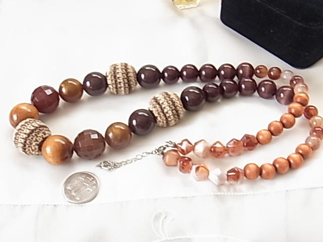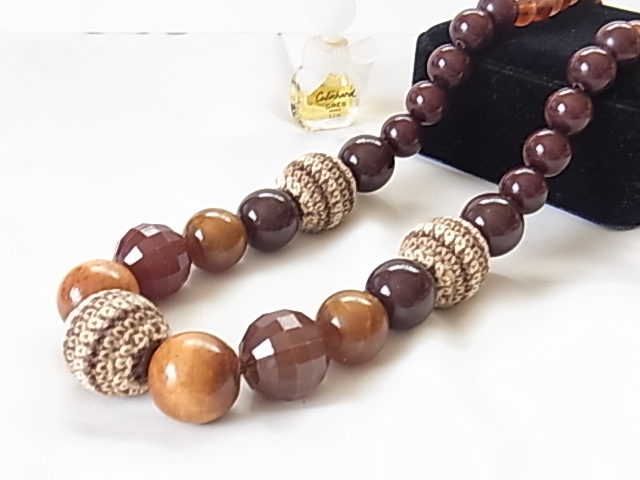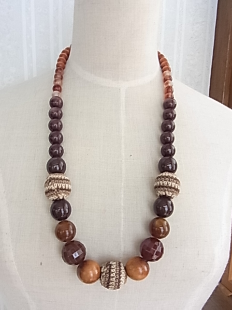 アジアン調 大き目のボールビーズストーンと木製ストーンと生地貼りのストーン ブラウン系のカラー 重厚感 ロングネックレス◆◆