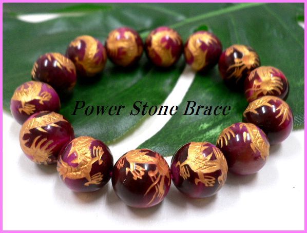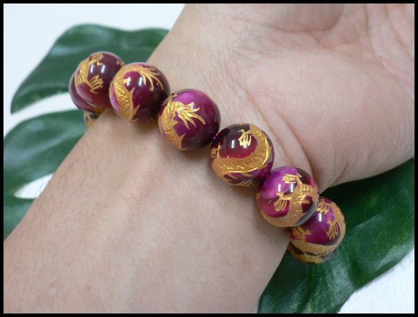◆天然石ブレス在庫処分◆14mm珠 彫り龍[金箔]マゼンタタイガーアイ数珠ブレス/ラスト1点/オリジナル パワーストーンブレス