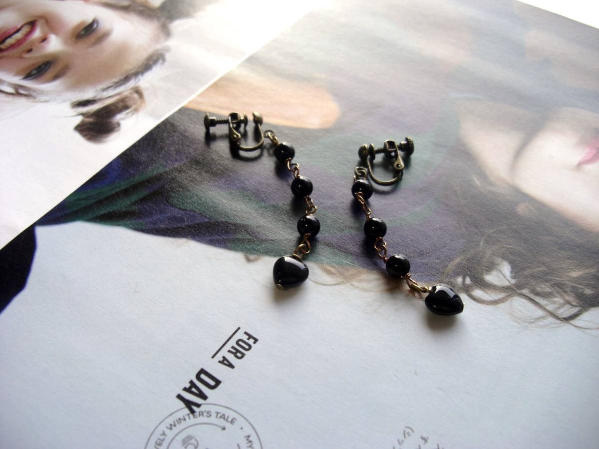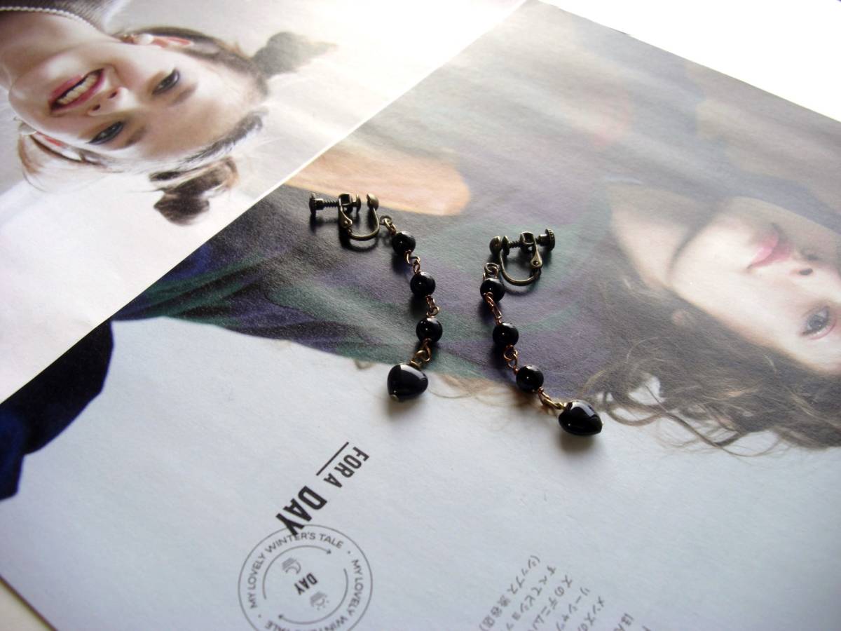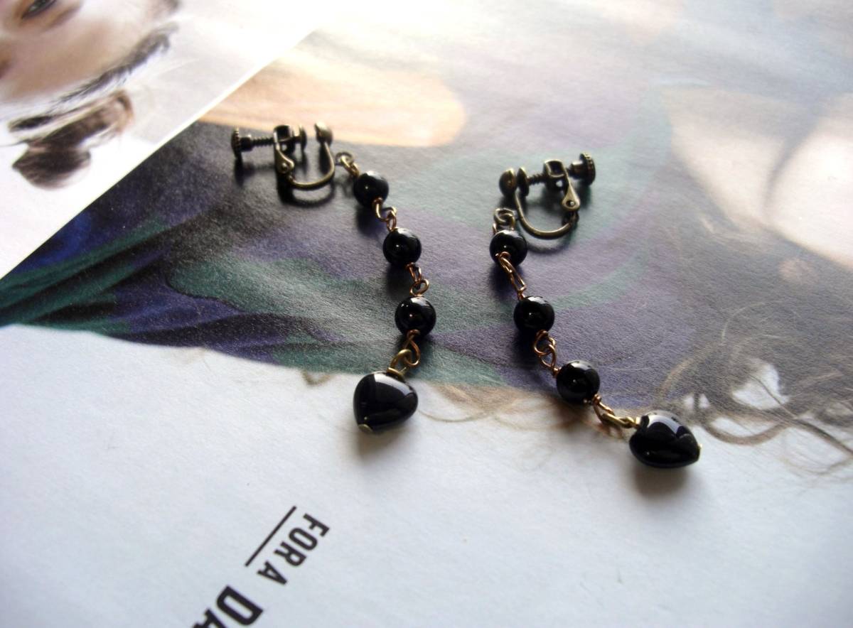 フレンチ・シック・・シリーズです♪オニキスのハート・・深い黒のオニキスのイヤリングです♪ペア1組です♪小粒の丸玉やハートのオニキスを繋いでキュートな表情です ♪4ミリの丸玉と8ミリのハートのオニキスを合わせました♪長さは6.5センチ位です♪ピアスにも変更出来ます♪お 揃いのネックレスやブレスレットも出品しています♪ハンドメイドをご理解頂いてノークレーム、ノーリターンでお願いします