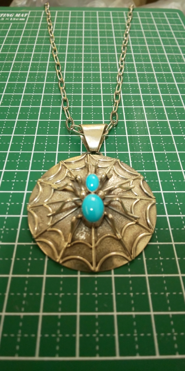 スパイダーネットをモチーフにして蜘蛛の背にはターコイズ、大きな目なペンダントです。