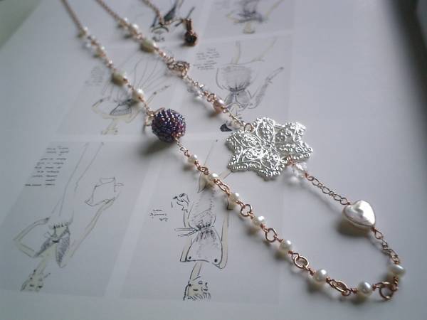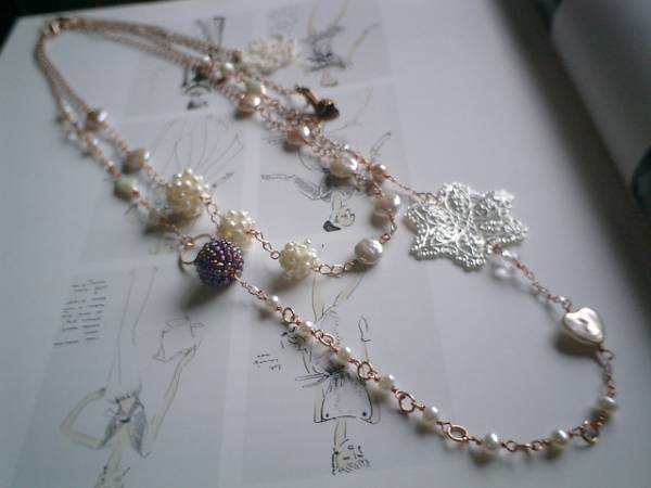 ロマンチックな淡水パールシリーズです♪♪素敵な夢を見て!淡水パールを使ったネックレスシリーズ 2本セットです♪お色違い、形違いの淡水パールを使っていろいろな表情のネックレスを作りました♪それぞれ個性的でシンプルなデザインなので長く着けて頂けると思います♪長い方の淡水パールは4ミリから6ミリ位のポテト型や11ミリ位のハートや14ミリ×7ミリ位のダイヤ型です♪6ミリの水晶や12ミリ位のグレーパープルのビーズ玉やシュガーパールや35ミリ位の透かしパーツを合わせてピンクゴールドのチェーンでまとめました♪可憐でロマンチックな表情です♪長さは全長86センチ位で調節自由です♪2連にしても可愛いです♪短い方は9ミリのコイン型と11ミリ、13ミリ、15ミリ位の淡水パール玉です♪シンプルで飽きのこないいつまでも着けられるデザインを考えて作りました!長さは全長62センチ位で調節自由です♪それぞれ単品やお揃いのシリーズでデザイン違いのネックレスも出品しています。ハンドメイドをご理解頂いてノークレーム、ノーリターンでお願いします