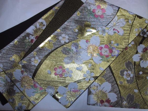 なお、帯柄左上に無地で出ているところは裏無地で、柄と柄の間に出ているところは手先と前太鼓のあいだの無地部分です。六通柄です。金銀糸が多用されているためストロボの照りで、しろぽく写っている部分があります。