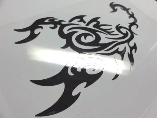 鏡面タイプのトライバルステッカーです。風雨はもちろん紫外線・海水にも強いステッカーで、屋外で5年の耐久性があります。(http://www.be-sticker.com/では他のステッカーもご覧いただけます)