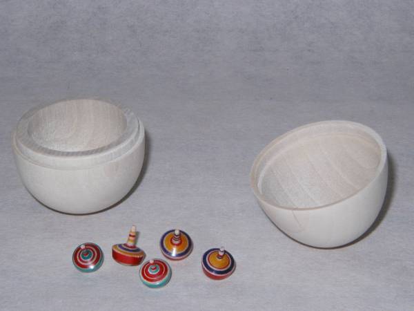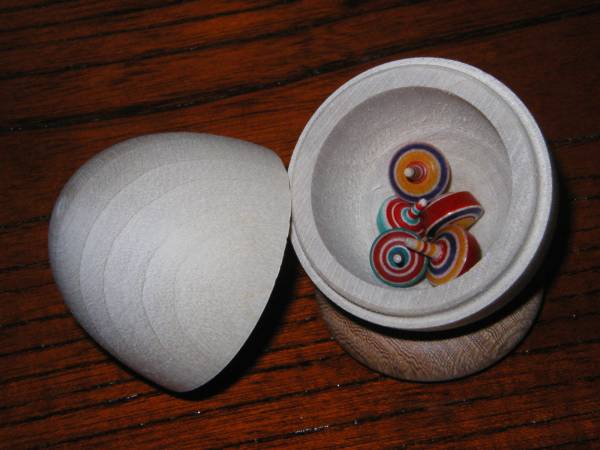 < 当店の出品物は全て新品で、国産です~~画像は何度も利用させていただきます~~同所の制作品です、多少の彩色、サイズ違いはご了承下さい > ●サイズ 5,5 x 4cm [玉子] 1,5(径) x 1,8(高さ)cm[ミニ独楽] ●「ミニ独楽」はよーーく回ります。しかも、5ツも付いています。「瓢箪から駒」ではなく「玉子から独楽」なのです。「玉子」は勿論、本物の卵ではありません。木を削った合口(あいくち)の玉子の内にミニ独楽を5ツ入れて1セットにしました。小さな独楽ですから、遊んだ後、ホッタラカシテおくと無くしてしまい そうです。玉子に収めておけば無くしません。 ●画像3は独楽が収まった状態です。 ●卵を支えているのは「エッグスタンド(別売り)」ですが、箸置やスカーフホルダー等多目的リングとして店舗にて販売しております。 ●卵の材質/ミズキ 独楽の材質/ミズキ ●送料 ¥290円(定形外郵便)