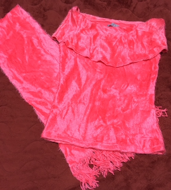 ★USED美品2点セット★Q・TO・P★ふわふわ起毛の可愛いオフショルダーニットカットソーとマフラー♪★2(M~L)★優しいピンク★★