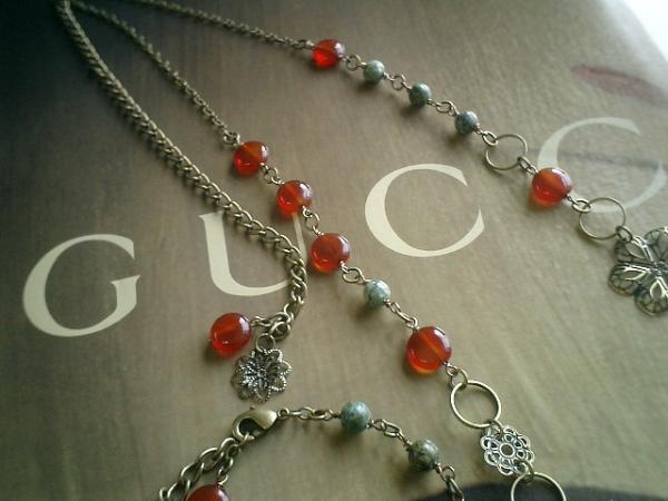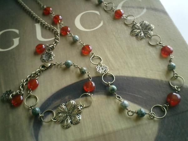 私らしく(♪)シリーズ!です♪さりげなくいつも着けて頂けたらとシンプルで可愛いネックレスを作りました♪ターコイズと深い赤のレッドアゲートのネックレスとブレスレットです♪お揃いで着けて頂きたいので2本セットです♪ターコイズは6ミリの丸玉でレッドアゲートは8ミリのコインです♪シックなお花のチャームを合わせてさりげなくロマンチックしています♪ネックレスの長さは全長74センチ位で調節自由です♪2連にしてもブレスにしても可愛いです♪ブレスレットは全長21センチ位で調節自由です♪♪軽いので普段にもお出かけにも着けて頂きたいです♪シンプルでいつまでも着けられるデザインを考えて作りました!♪カジュアルからロマンチックまでお楽しみいただけます。ハンドメイドをご理解頂いてノークレーム、ノーリターンでお願いします
