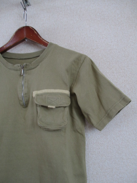 | 商品紹介 | 薄いカーキの半袖Tシャツです。 襟元に付いたファスナーと後ろ裾の プリント入りのポケットがポイントになっています。 《素材》 綿100% |