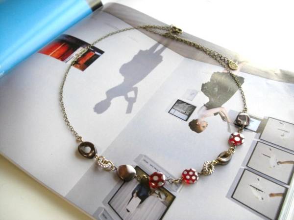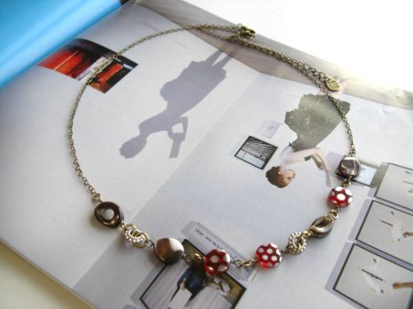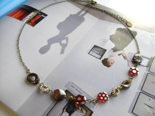 モダン・ガール・・シリーズです♪水玉マニア・・シックな水玉とシェルのネックレスです♪ダークレッドの水玉とブラウングレーのシェルがロマンチックな表情です♪10ミリのディスクのチェコビーズはダークレッドにシルバーグレーの水玉です♪大きさ違いの水玉を合わせました♪ブラウングレーのシェルは10×14ミリ位のオーバルとリングです♪デザインチャームを合わせてキュートにロマンチックしています♪長さは52センチ+アジャスター8センチで最長60センチ位です♪お揃いのブレスレットやピアスも出品しています♪♪シンプルで長く着けていただけるデザインを考えて作りました♪♪ハンドメイドをご理解頂いてノークレーム、ノーリターンでお願いします。