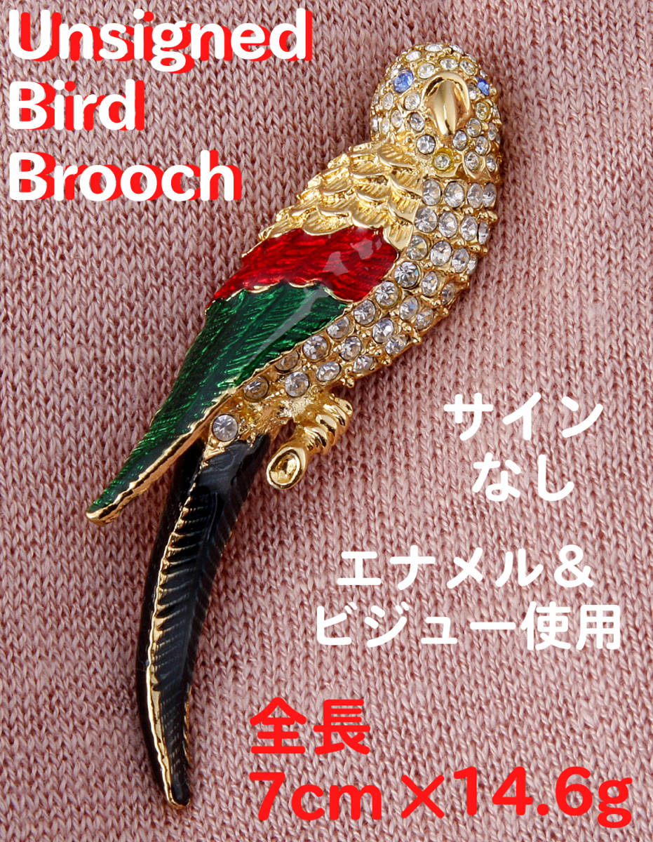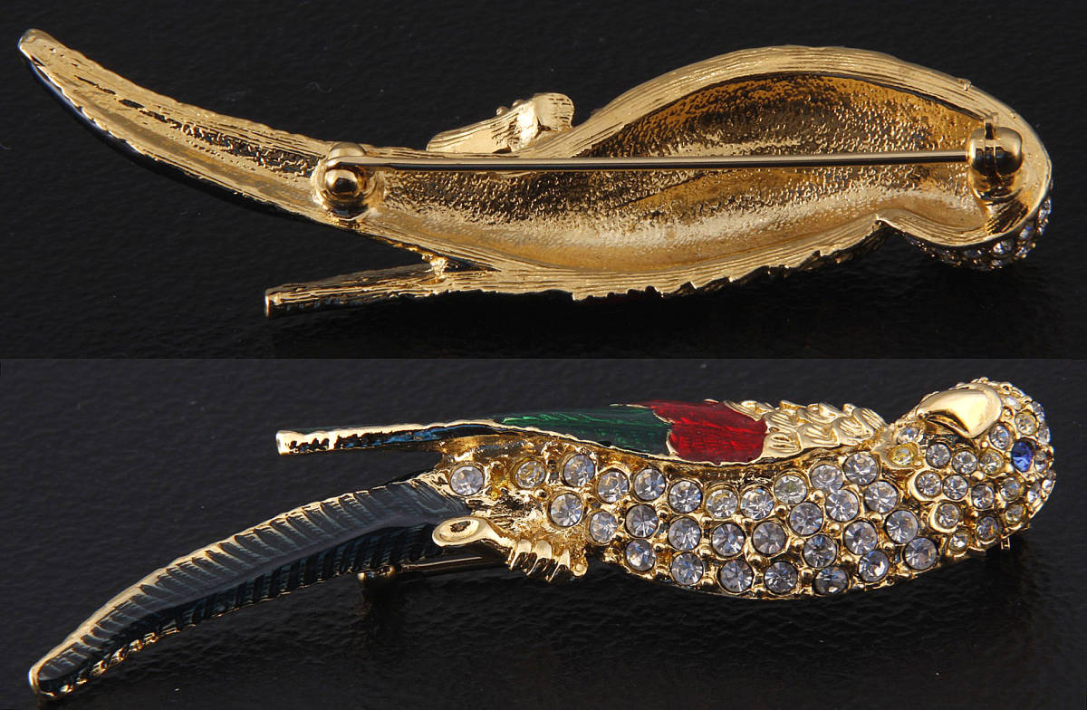 鳥のブローチ エナメル×ビジュー×ゴールドカラー たて7㎝ 14.6g サインなし USED