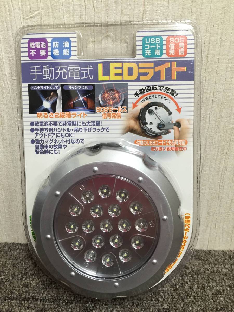ご 説 明 | 富士商 手動充電式LEDライト F5829 新品 メーカー: 富士商 手動回転で充電! 左右どちらの回転でもOK! 乾電池不要で 非常時にも大活躍! 手持ち用ハンドル、吊り下げフックでアウトドアにもOK! 強力マグネット付きなので自動車の故障や緊急時にも! 明るさ2段階ライト。 SOSモールス信号発信。 付属のUSBコードでも充電可能。 LEDは4種類に切替可能 ① 白色LED 16灯(暗) ② 白色LED 16灯(明) ③ 赤色LED 3灯(点灯) ④ 赤色LED 3灯(SOSモールス信号) ※こちらの品物は新品ですが、 パッケージにいくらかの傷があります。 |
