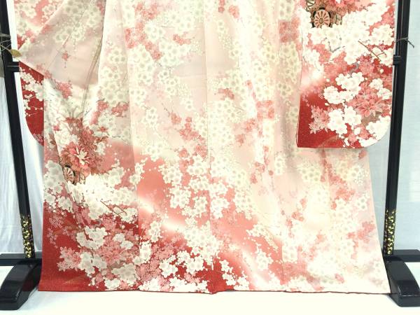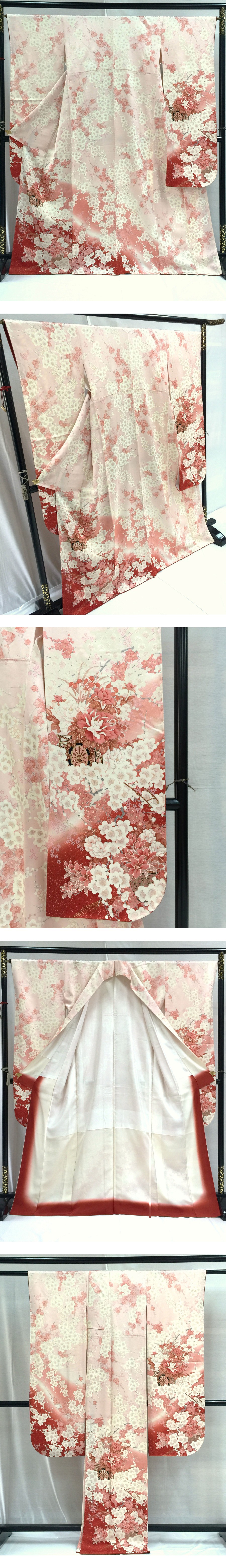 全体的にピンク基調ですが、裾には京友禅らしく力強い赤が用いられ、メリハリの効いた色柄かと思います。