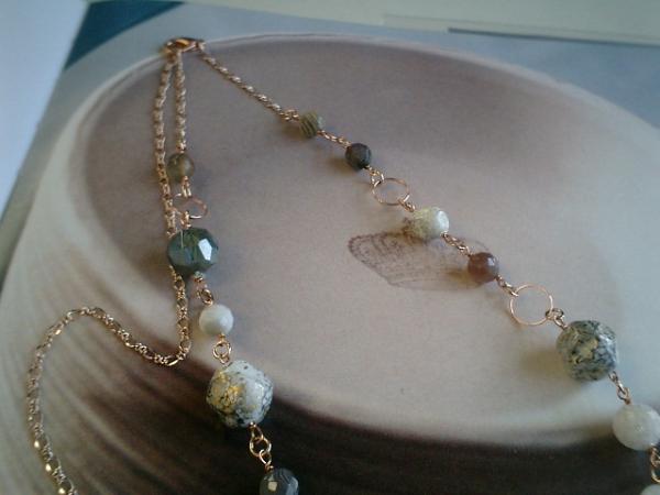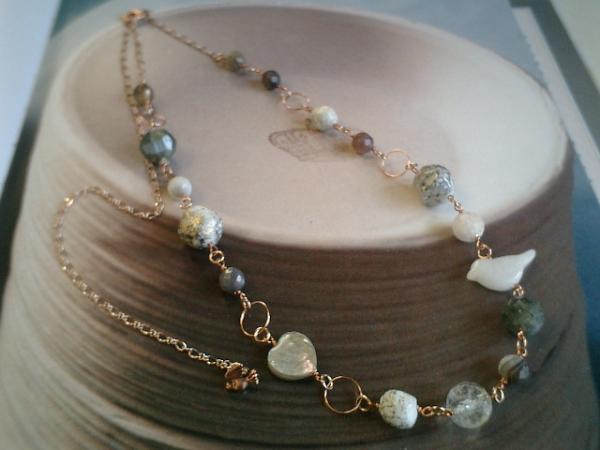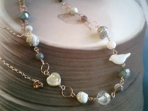 パリの小鳥さんシリーズ第1弾です♪大人っぽいロマンチックなネックレスです♪シックな異素材を集めて作りました♪パリ(??)っぽいアンティークな雰囲気で作りました。ホワイトジェイドの小鳥さんは11×25ミリ位です。8ミリの丸カットのボツワナアゲート、14ミリのグレーシェルのコイン型、12ミリの丸カットのルチルクォーツ、10ミリ、12ミリのヴィンテージビーズをやさしいピンクゴールドのリングやチェーンでランダムにつないでいます♪シックなお色でまとめていますので大人っぽい可愛さです♪長さは全長72センチで調節自由です。2連にしたりぐるぐる巻いてブレスレットにしても可愛いです♪飽きのこないいつまでも着けられるデザインを考えて作りました!お揃いのブレスレットも出品予定です♪ハンドメイドをご理解頂いてノークレーム、ノーリターンでお願いします