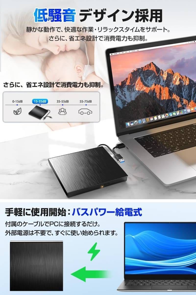 • 【手軽な使い心地・バスパワー給電式】 面倒な電源設定は一切不要。このcd dvdドライブ 外付けはバスパワー給電式で、付属のケーブルでPCに接続するだけで動作開始します。外出先でも、オフィスでも、どこでも手軽に使用できる究極の便利さを提供します。