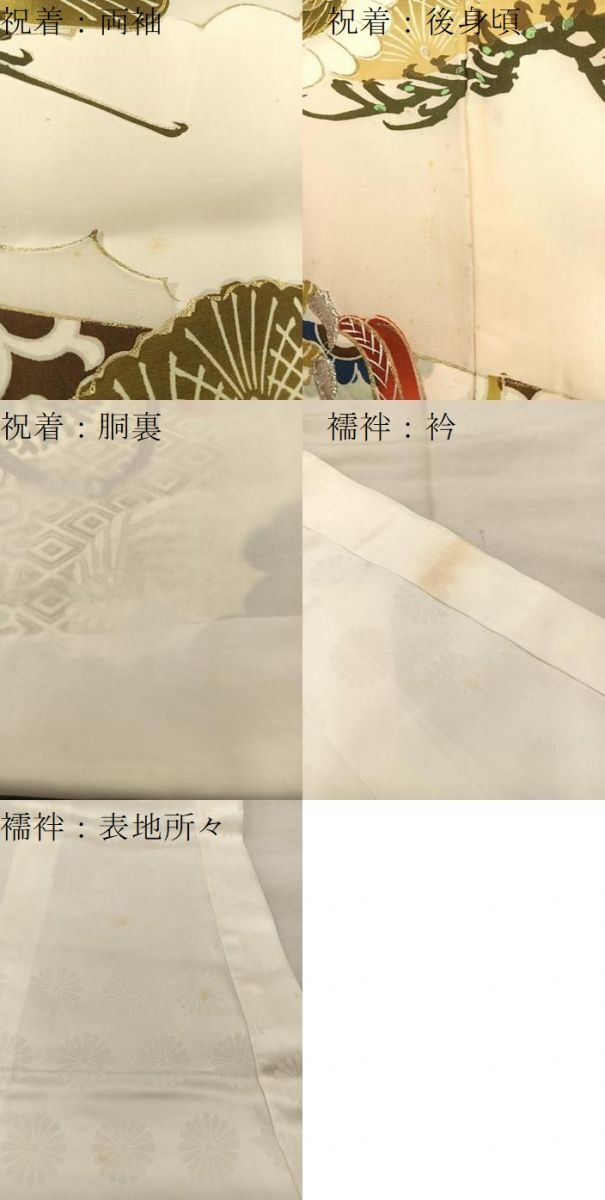 | 産着【正絹・五つ紋】の状態は接写画像のように 両袖・後身頃・胴裏に薄い汚れがございますが その他特に目立ったシミ汚れなどもなく大変良い状態です。 長襦袢【化繊】の状態は接写画像のように 衿・表地所々に薄い汚れがございますが その他特に目立ったシミ汚れなどもなく大変良い状態です。 大変上質な逸品になります。 お安く出品致しますので、是非この機会にいかがでしょうか?