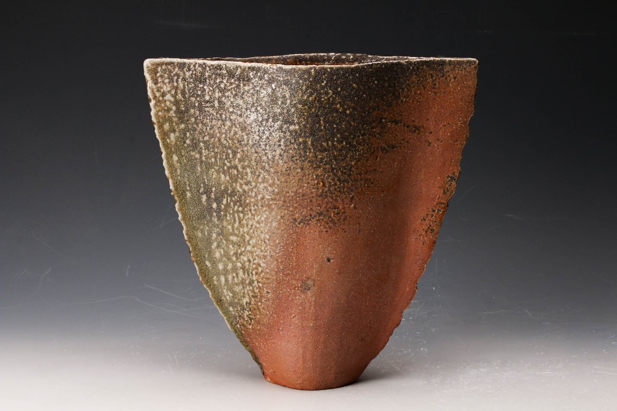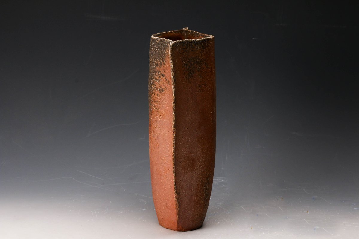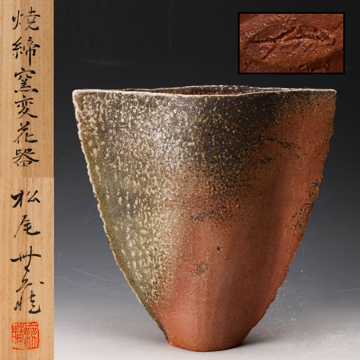 【佳香】松尾無蔵 高さ25cm 焼締窯変花器 共箱 栞 本物保証