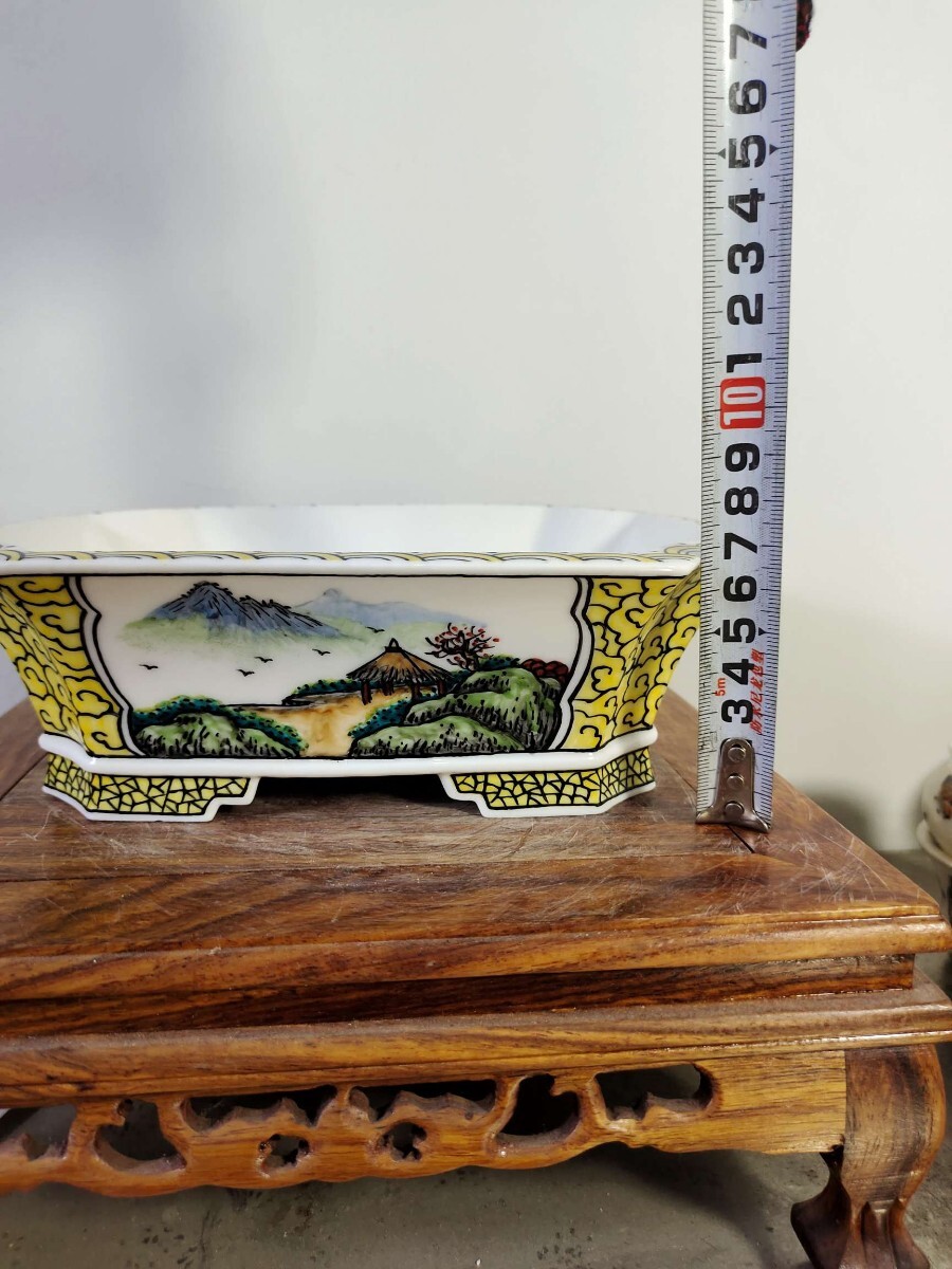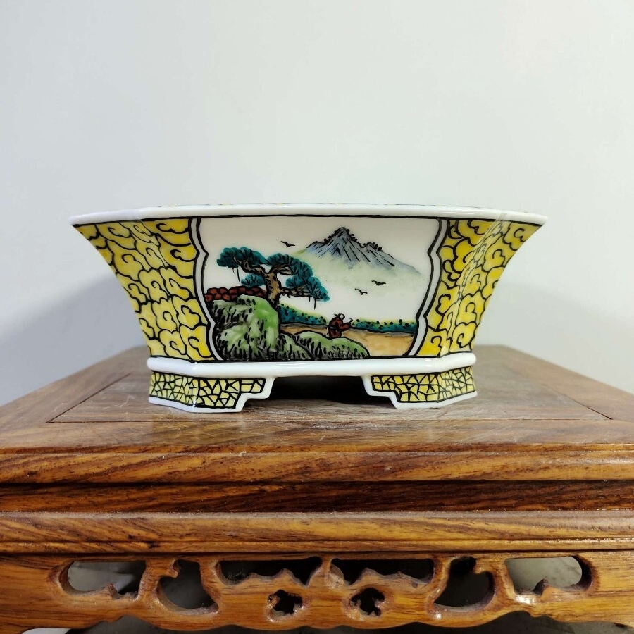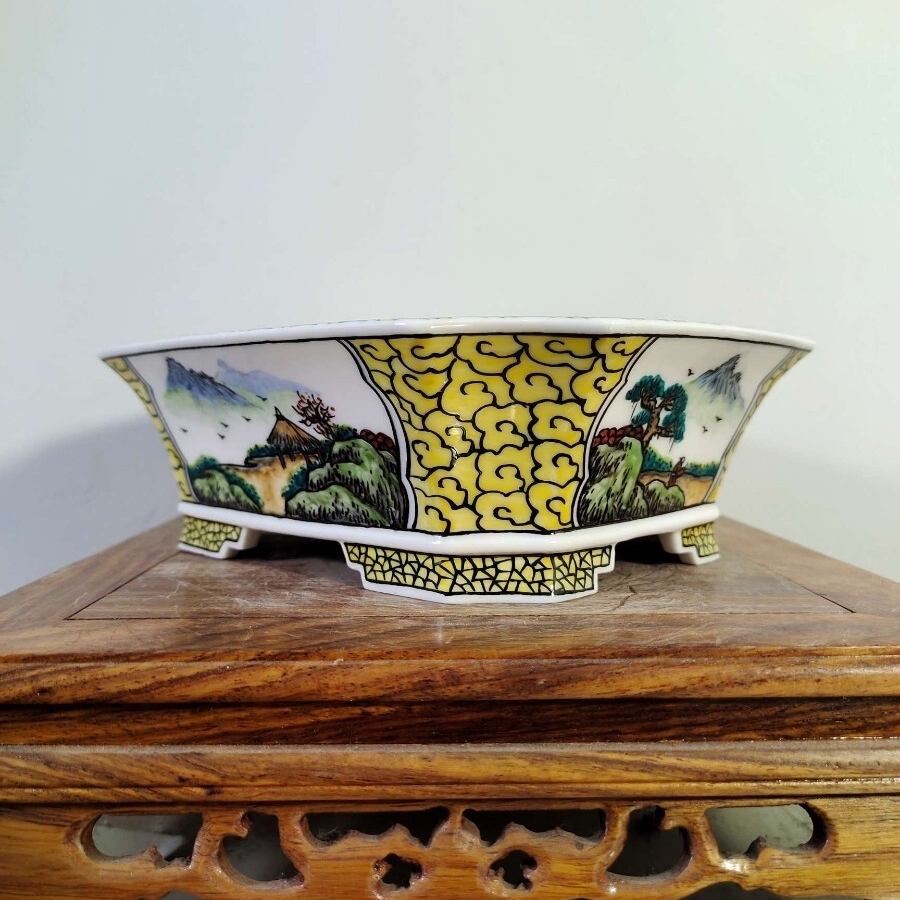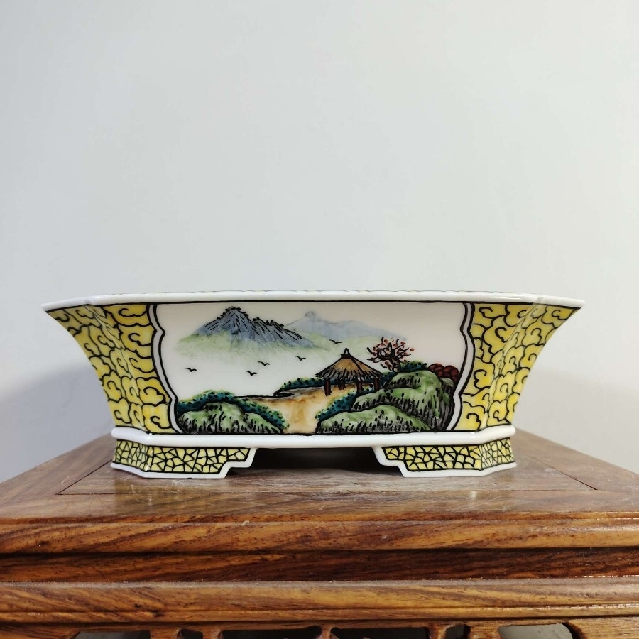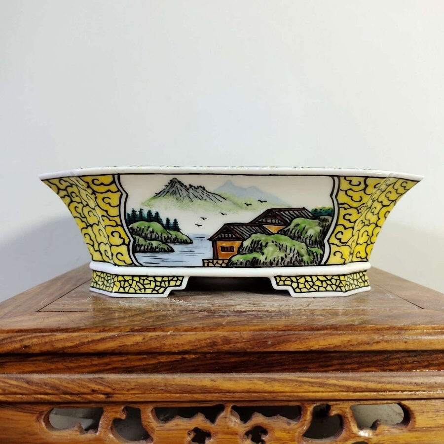 「長方鉢」の空間アクセントこの長方鉢は、盆栽植物(特に和風の小盆栽)と組み合わせることで「山水が広がる荘厳な小景観」を演出できるだけでなく、単体で飾るだけでも、和室やリビングといった空間に「伝統工芸の精緻さと開窓山水の美」をアクセントとして加え、格調高い雰囲気を創り出します。