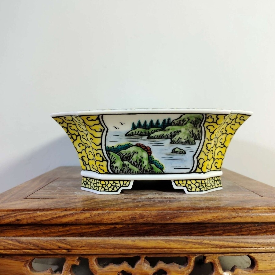 「五彩開窓 × 長方鉢」の調和がもたらす装飾性と伝統美開窓による情景の深みと周囲紋様の華やかさが融合し、「伝統工芸の奥深さ」と「視覚的なインパクト」を両立させています。光が当たると釉薬の艶と絵具の彩りが絡み合い、文様の立体感と長方鉢の高級感が一層引き立ちます。